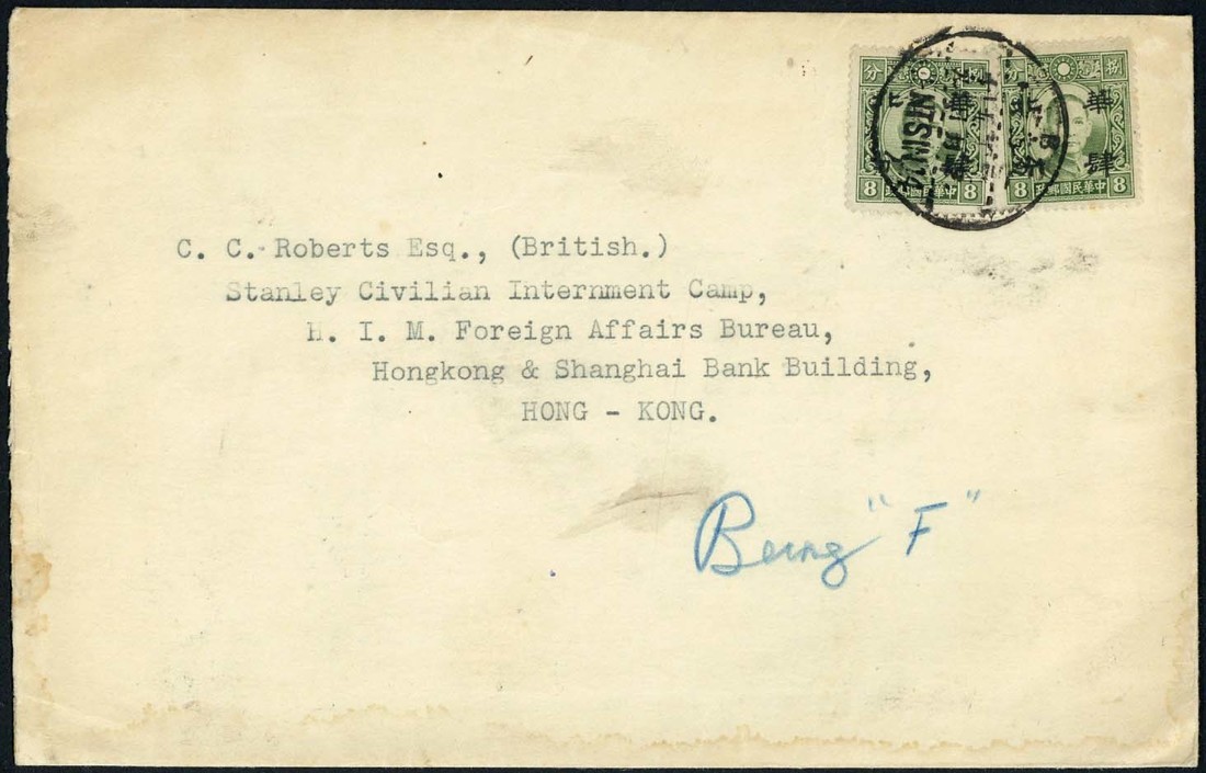 From China: 1942 (?) (7 Oct.) envelope to C.C. Roberts bearing Japanese Occupation of China 8c. (2) tied by Tientsin 14 c.d.s. and showing "Bung 'F'" in blue crayon. Without any censor markings. Tett fig. 4-4-10. Photo