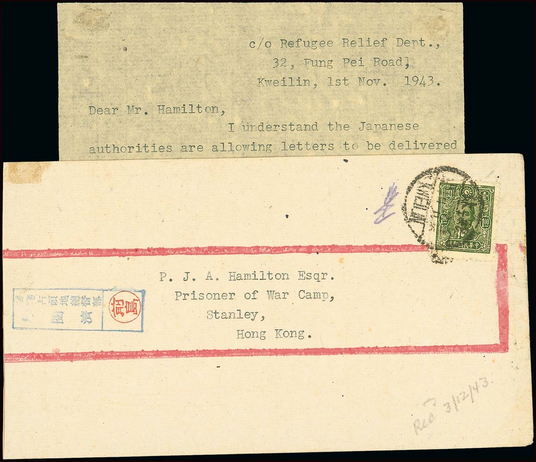 From China: 1943 (1 Nov.) envelope from Free China to P. Hamilton bearing Sun Yat Sen $1 tied by Kweilin c.d.s. and bearing a good strike of the Governor General's Department censor handstamp in blue with Maejima seal and pencil "Recd 3/12/43". With the original letter addressed "c/o Refugee Relief Dept., 32 Fung Pei Road, Kweilin". Scarce mail from Kweilin. Tett fig. 4-4-31. Photo