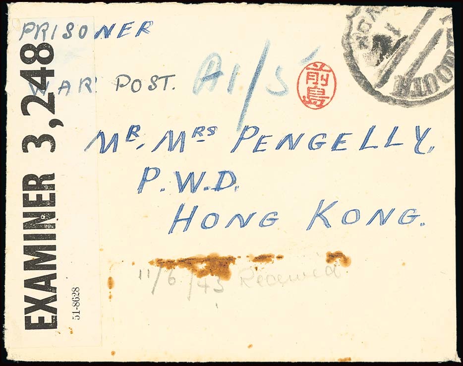 From U.K.: 1942 (23 June) stampless envelope to Pengellys bearing Plymouth despatch postmark without date, sent Prisoner of War Post and with British censor seal at left, Maejima seal, "A1/5" in blue crayon and pencil "11/6/43 Received". With the original two page letter from their mother, each page with Japanese censor seal. Fine and one of the earliest items of mail from the U.K. Tett fig. 4-4-6. Photo