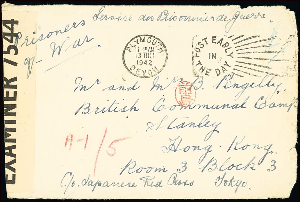 From U.K.: 1942 (13 Oct.) stampless envelope to Pengellys bearing Plymouth "post early in the day" slogan postmark, sent Prisoners of War Post and with British censor seal at left, with Maejima seal and "A-1/5" in red crayon; the reverse with delivery "24/6/43"; some creasing at right. A good cover. Photo