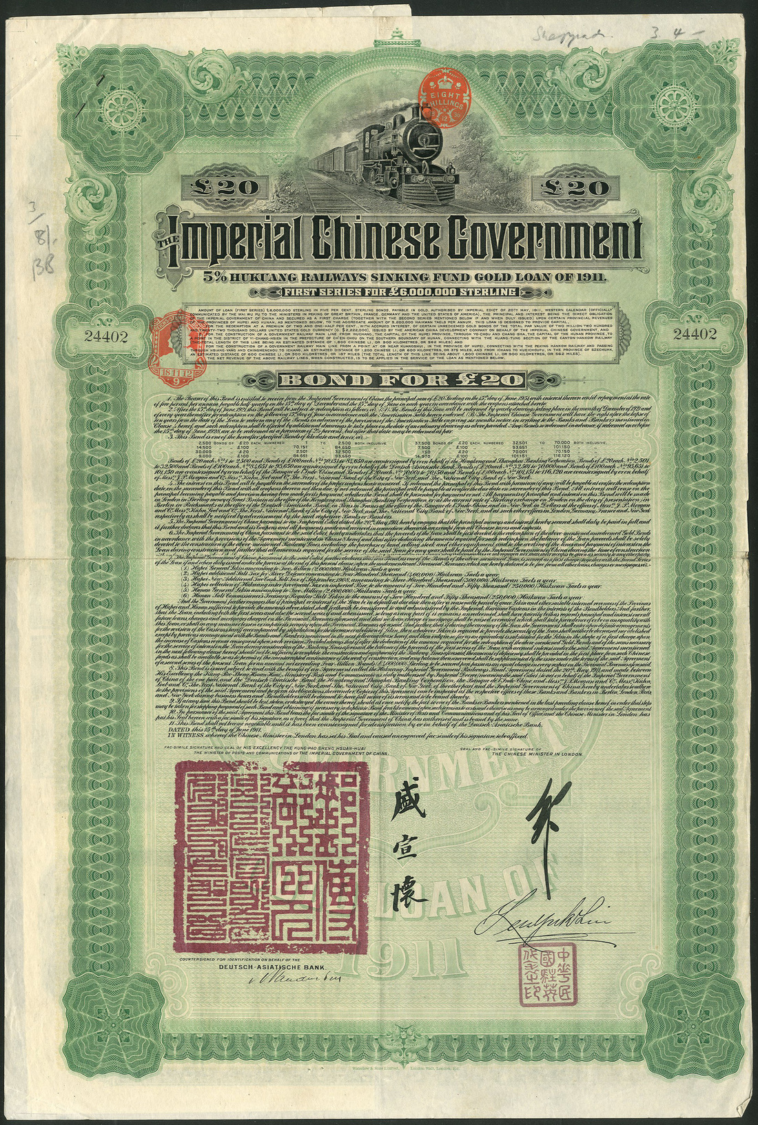 China: 1911, 5% Hukuang Railways Sinking Fund Gold Loan, a group of 22 bonds of £20, issued by the Deutsch-Asiatische Bank, large format, steam train at top, green and black, printed by Waterlow & Sons, with coupons, mostly about very fine. (22)