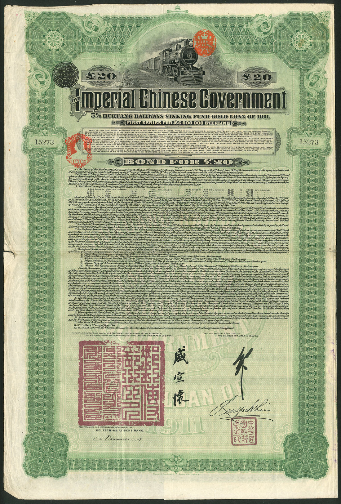 China: 1911, 5% Hukuang Railways Sinking Fund Gold Loan, a group of 31 bonds of £20, issued by the Deutsch-Asiatische Bank, large format, steam train at top, green and black, printed by Waterlow & Sons, with coupons, fine to very fine. (31)