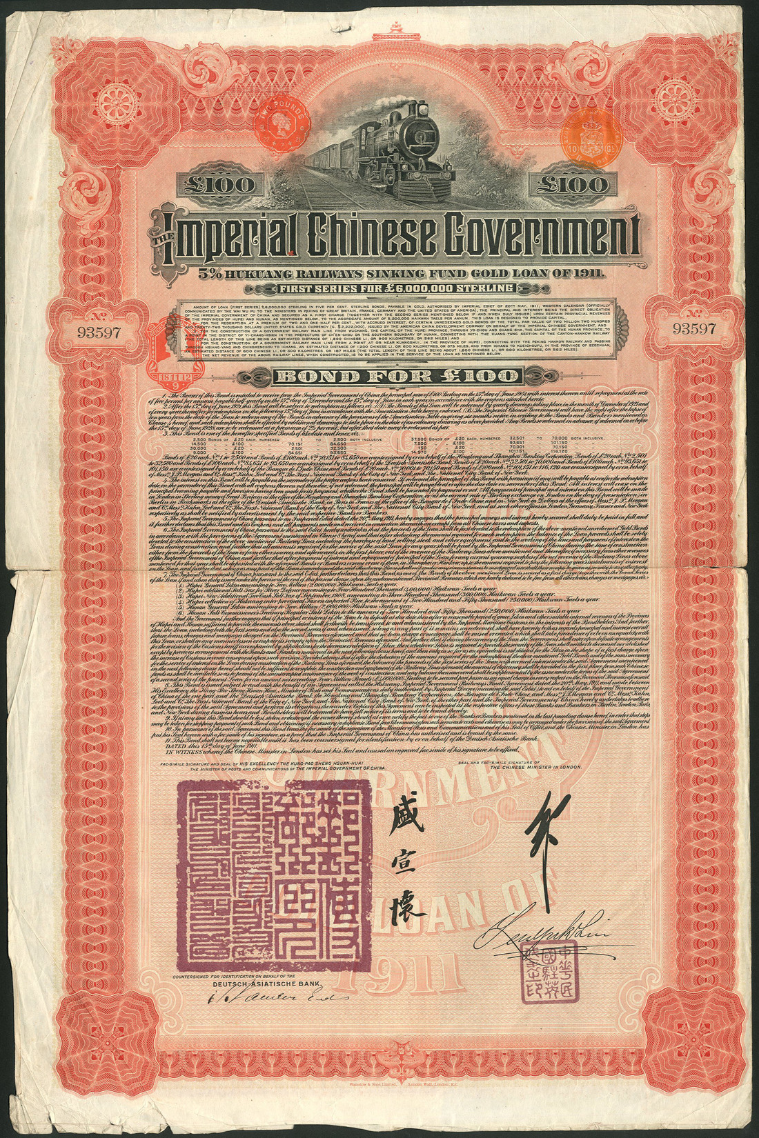 China: 1911 5% Hukuang Railways Sinking Fund Gold Loan, a group of 13 bonds for £100, issued by the Deutsch-Asiatische Bank, large format, steam train at top, red and black, printed by Waterlow & Sons, with coupons, generally about very fine. (13)