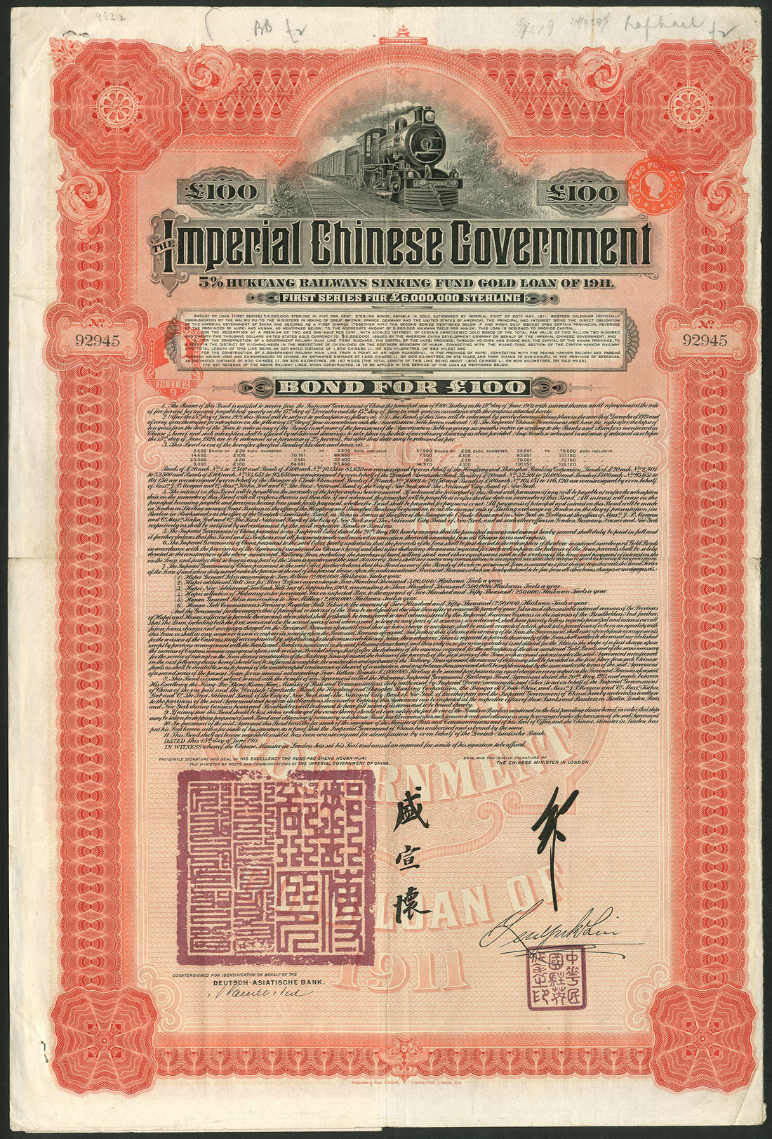 China: 1911, 5% Hukuang Railways Sinking Fund Gold Loan, a group of 20 bonds of £100, issued by the Deutsch-Asiatische Bank, large format, steam train at top, red and black, printed by Waterlow & Sons, with coupons, fine to very fine. (20)