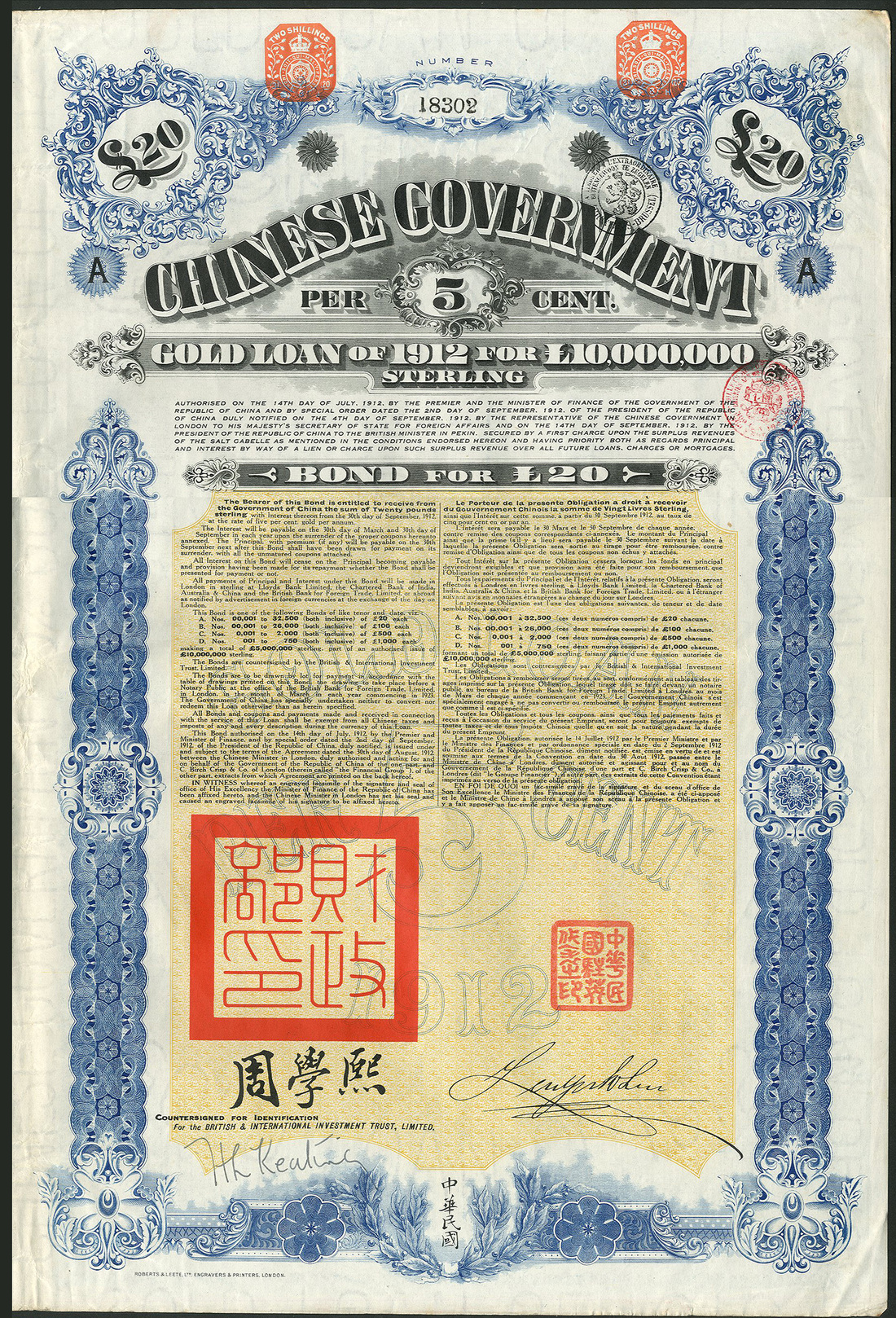 China: 1912 5% Gold 'Crisp' Loan, a group of 8 bonds for £20, large format with ornate borders, blue and yellow, with coupons, better than very fine. (8)