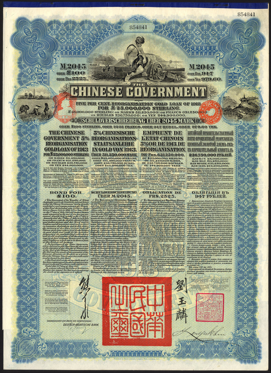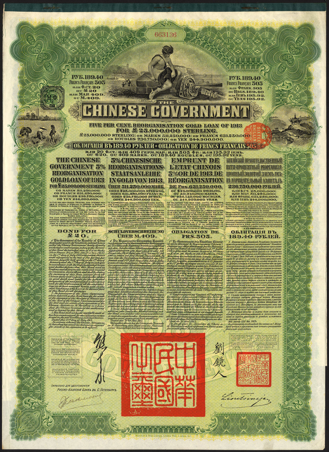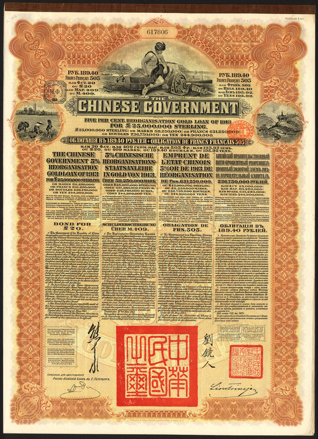 China: 1913 5% Reorganisation Gold Loan, a collection of bonds comprising £20, French issue, £20 and £100, German issue, £20, Russian issue, brown (2, one with Russian duty stamp), green, 'Mercury' at top, peasants and buildings at either side, with coupons, all extremely fine. (6)