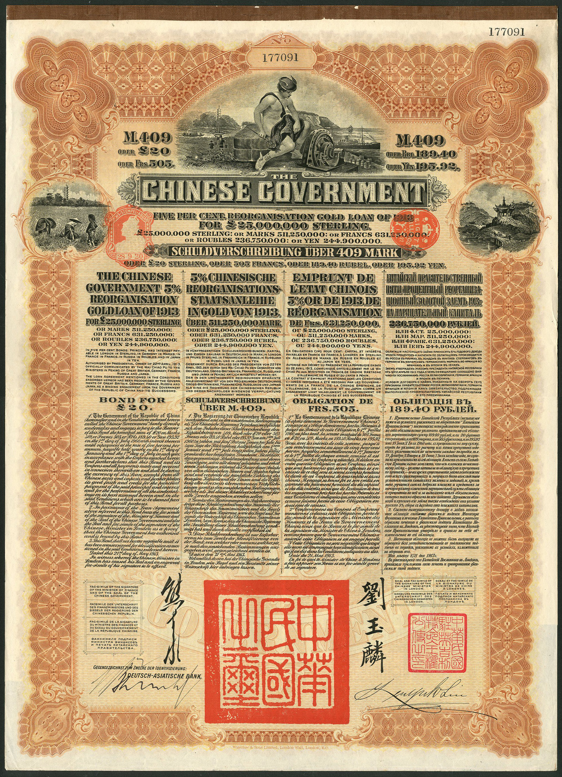 China: 1913, 5% Reorganisation Gold Loan, a group of bonds for £20 (20), all countersigned by the Deutsch-Asiatische Bank, Mercury at top, city view and peasants at either side, brown, printed by Waterlow & Sons, with coupons, mostly extremely fine. (20)