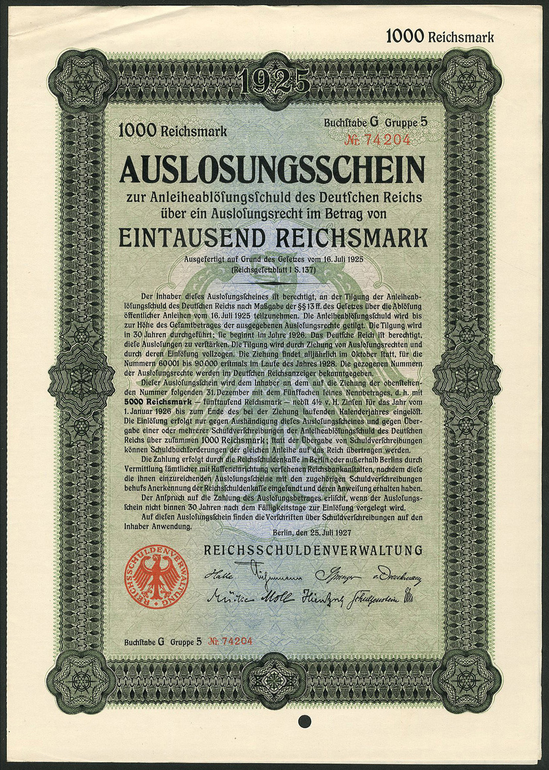 Anleiheablösungsschuld des Deutschen Reichs & Auslosungsschein / Replacement Loan & Drawing Certificat 1927, a very large quantity of [???] Ablösungsschein. Berlin 25.7.1927 [=Number 60'001-90'000] comprising 12.5 RM (), 25 RM (), 50 RM (), 100 RM (), 200 RM (), 500 RM (), 1'000 RM (), Auslosungsschein / Drawing certificate 1927, the majority are located in Berlin and the quantities available will be confirmed on our website, the loan certificate gave the right to participate in the drawing for redemption, the drawing certificate is the second page of the loan,