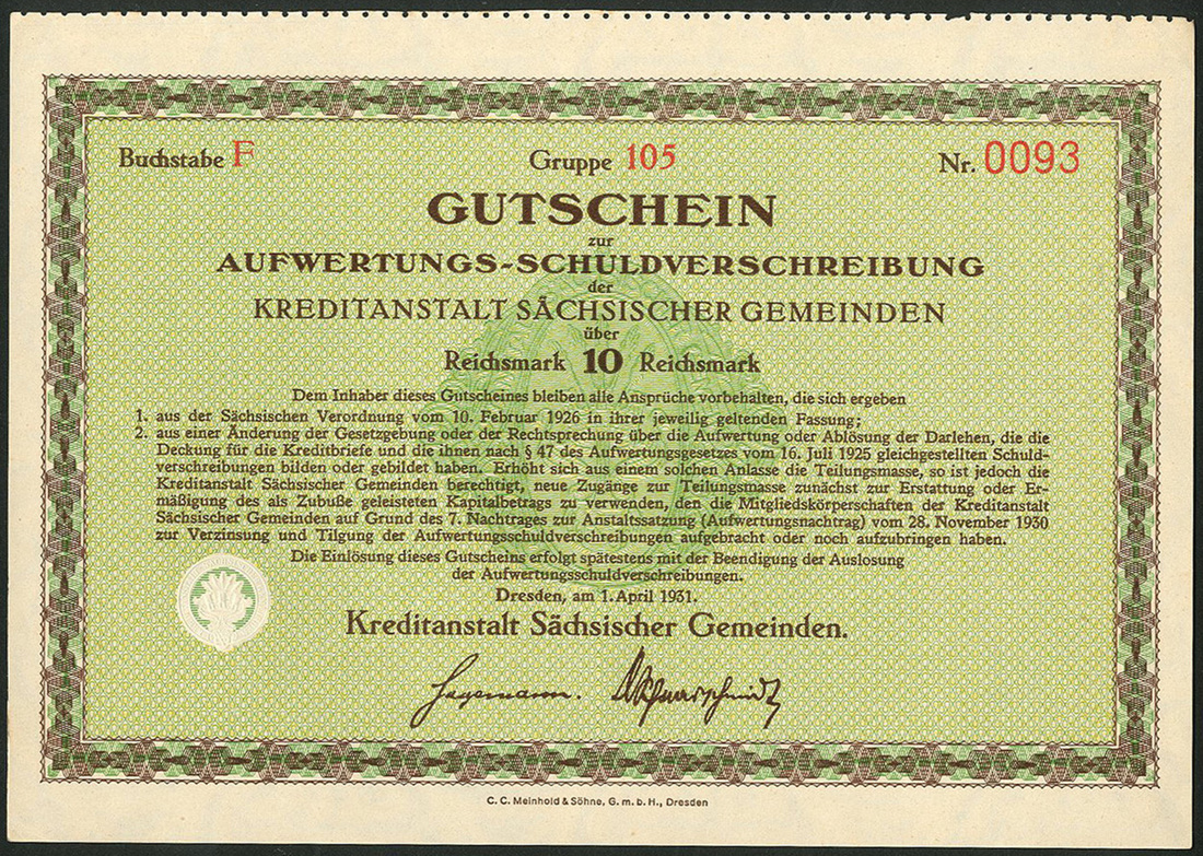 Kreditanstalt Sächsischer Gemeinden 1931, a group of 9 x Gutschein zur Aufwertungs-Schuldverschreibung, 10 RM, Dresden 1.4.1931, generally extremely fine. (9 items)