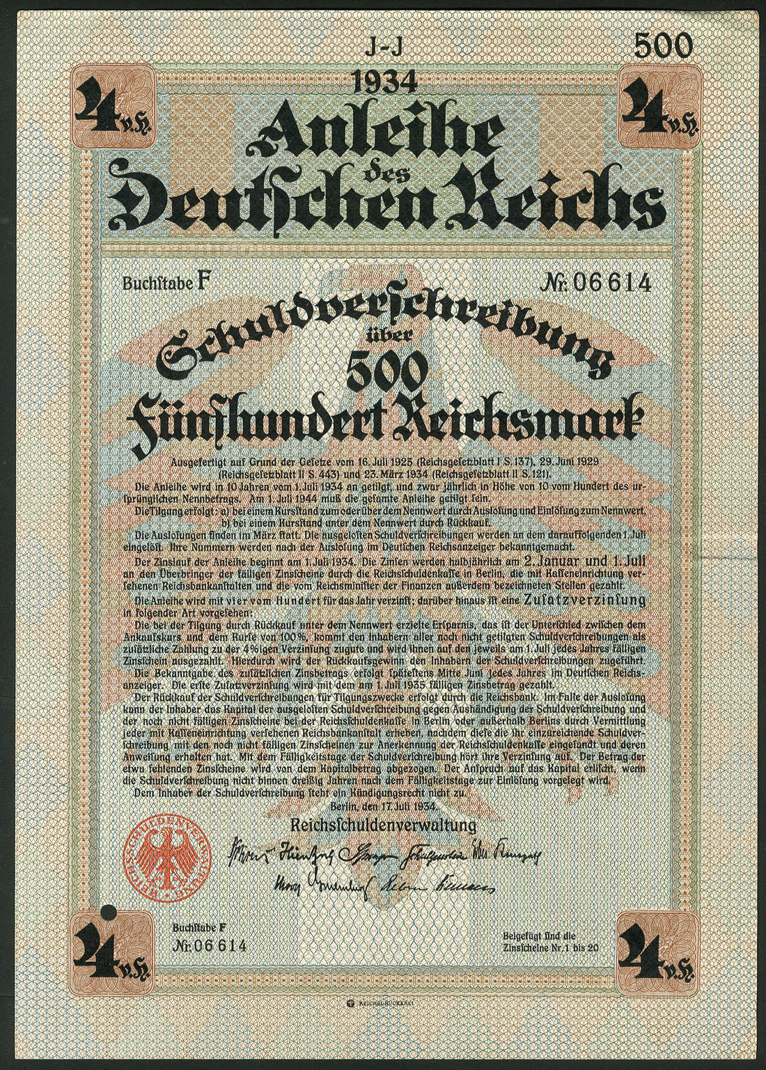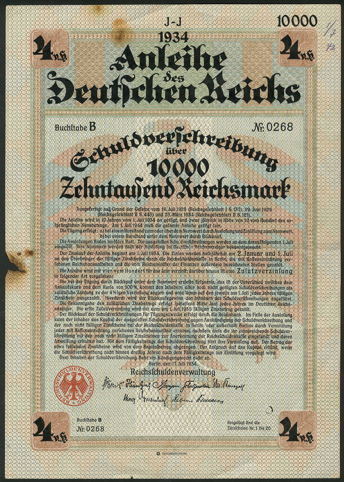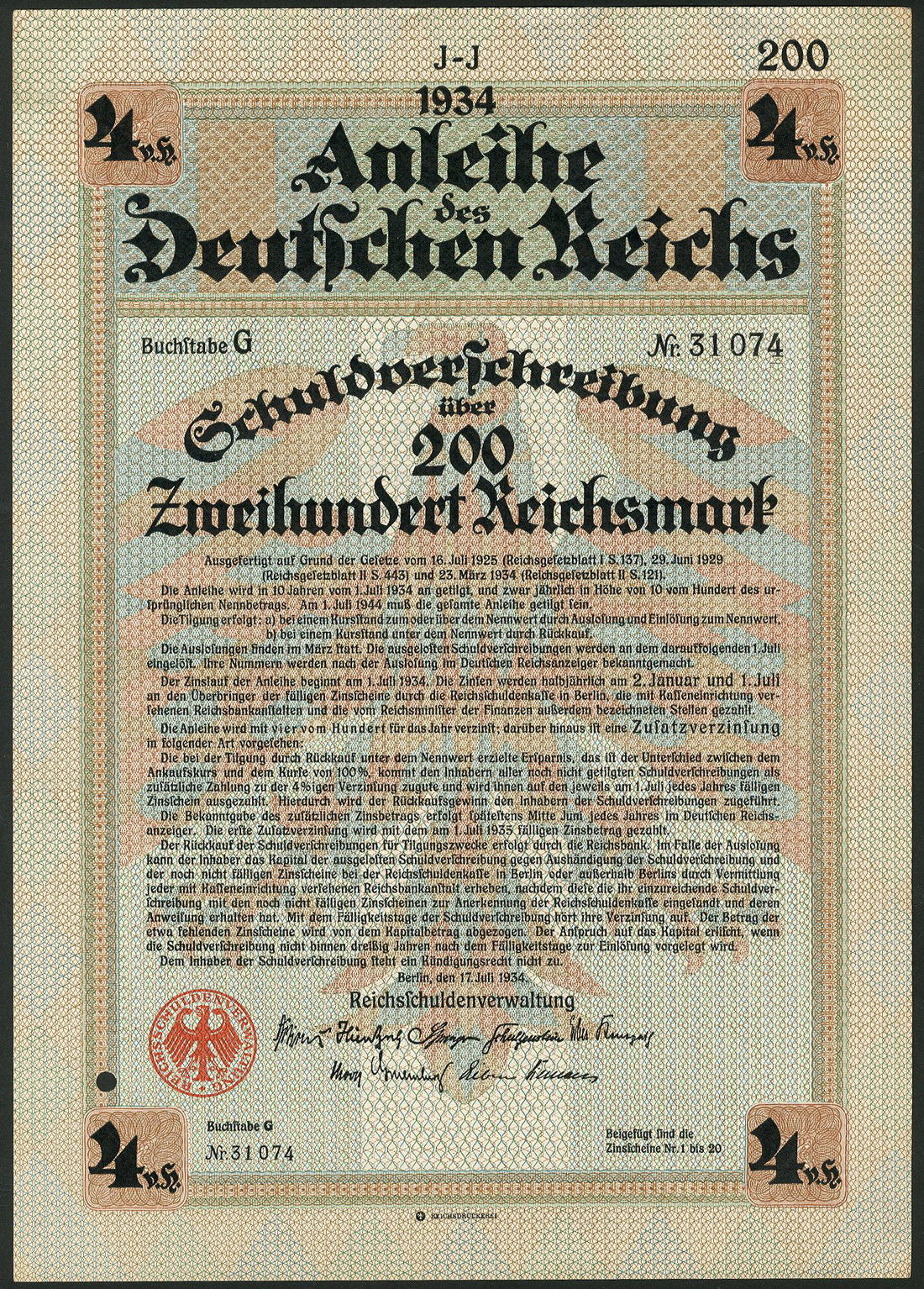 Anleihe des Deutschen Reichs / Nazi-Loan 1934, a group of 62 x 4% Schuldverschreibung, Berlin 17.7.1937 comprising 100 RM (29), 200 RM (17), 500 RM (11), 1,000 RM (4) and 10,000 RM (1), generally extremely fine. (62 items)