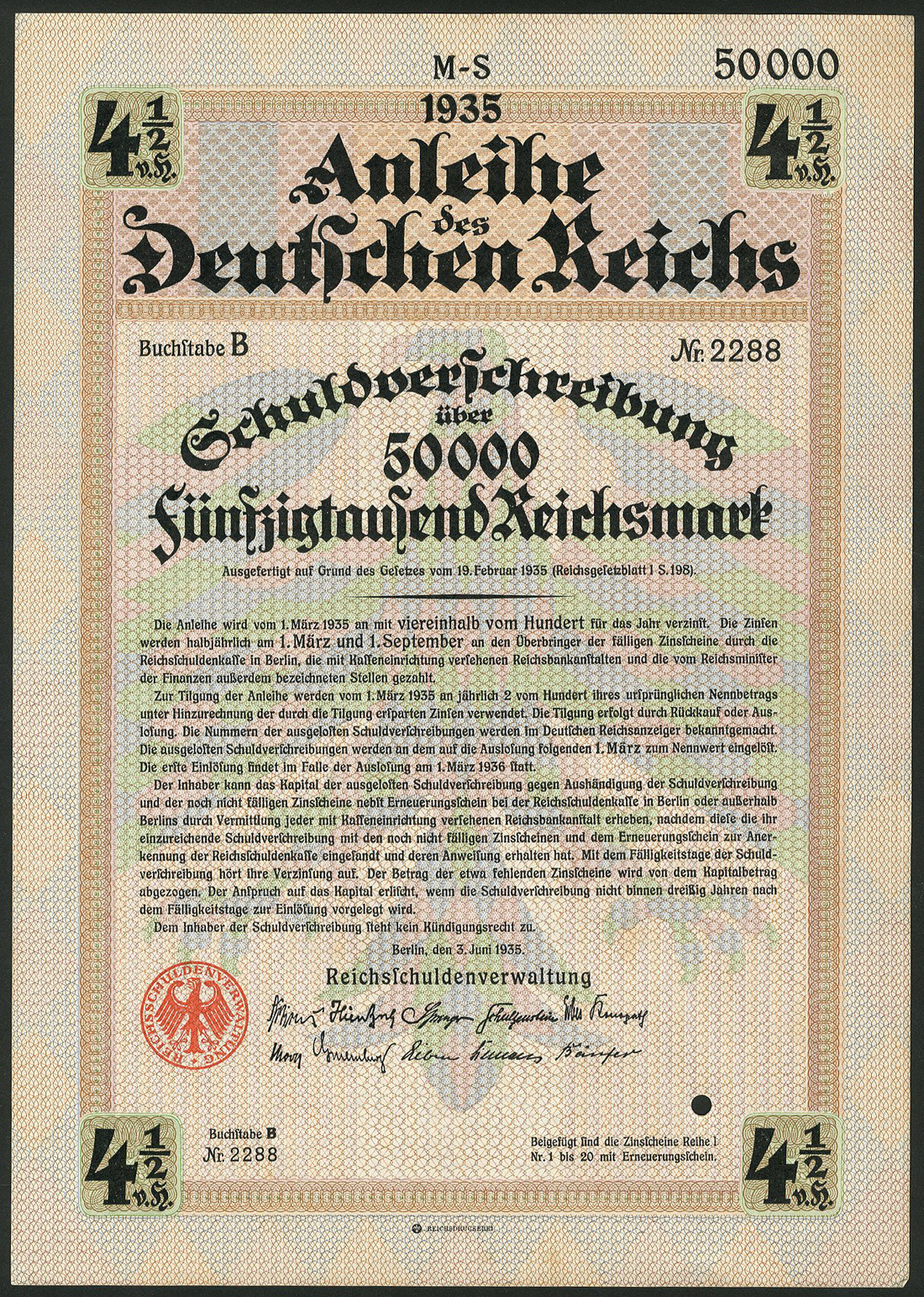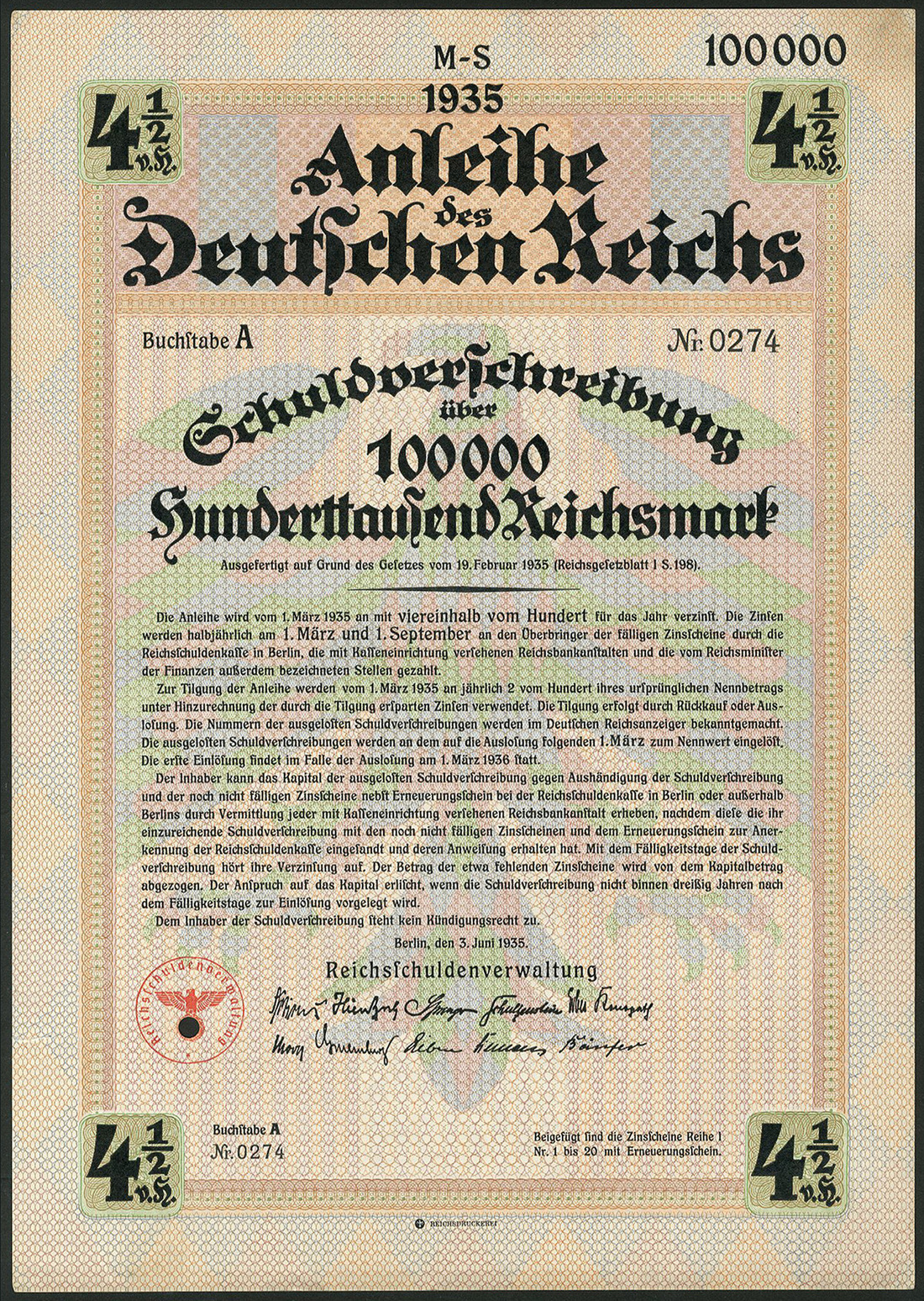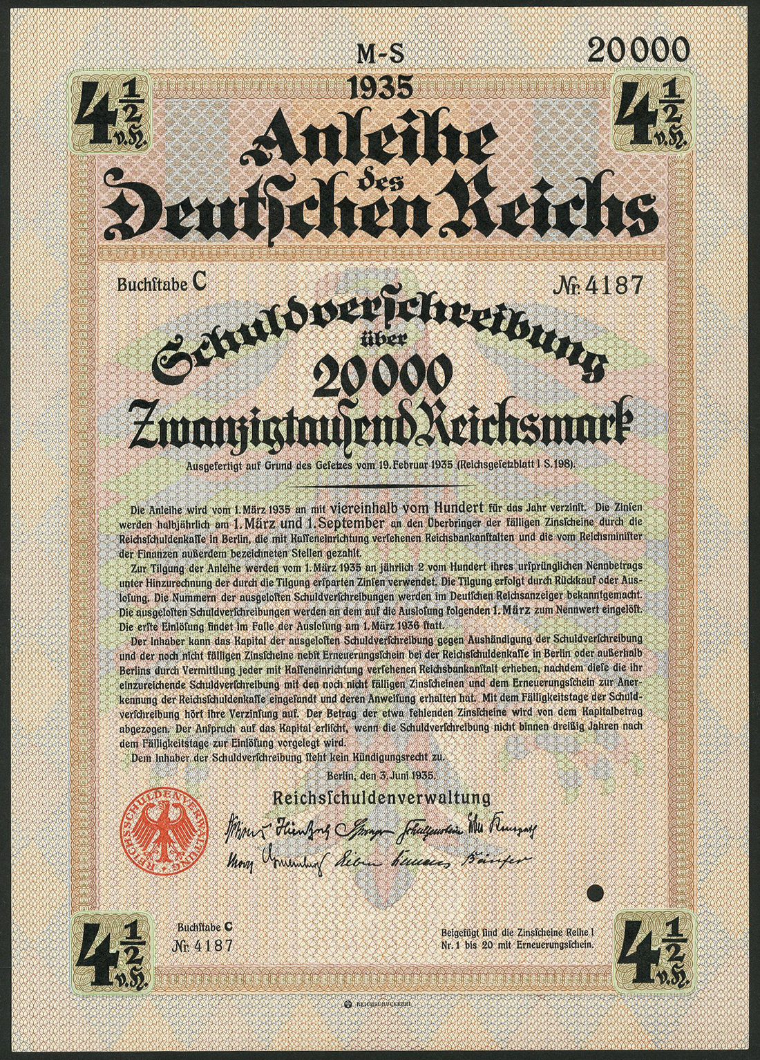 Anleihe des Deutschen Reichs 1935 Erste Ausgabe / Nazi-Loan 1935 First Issue, a group of 4158 x 4½% Schuldverschreibung, Berlin 3.6.1935 comprising 100 RM (38), 1,000 RM (2000), 10,000 RM (1700), 20,000 RM (158), 50,000 RM (120), 100,000 RM (142), [the majority located in Berlin], generally extremely fine. (4158 items)