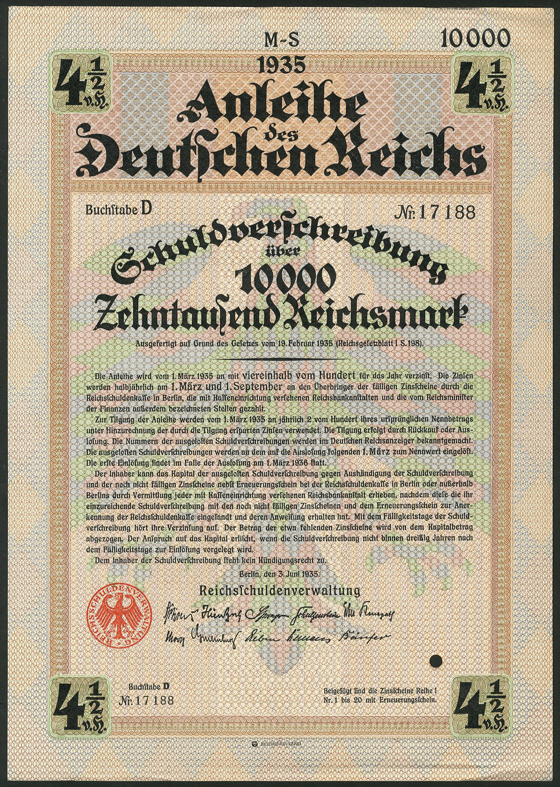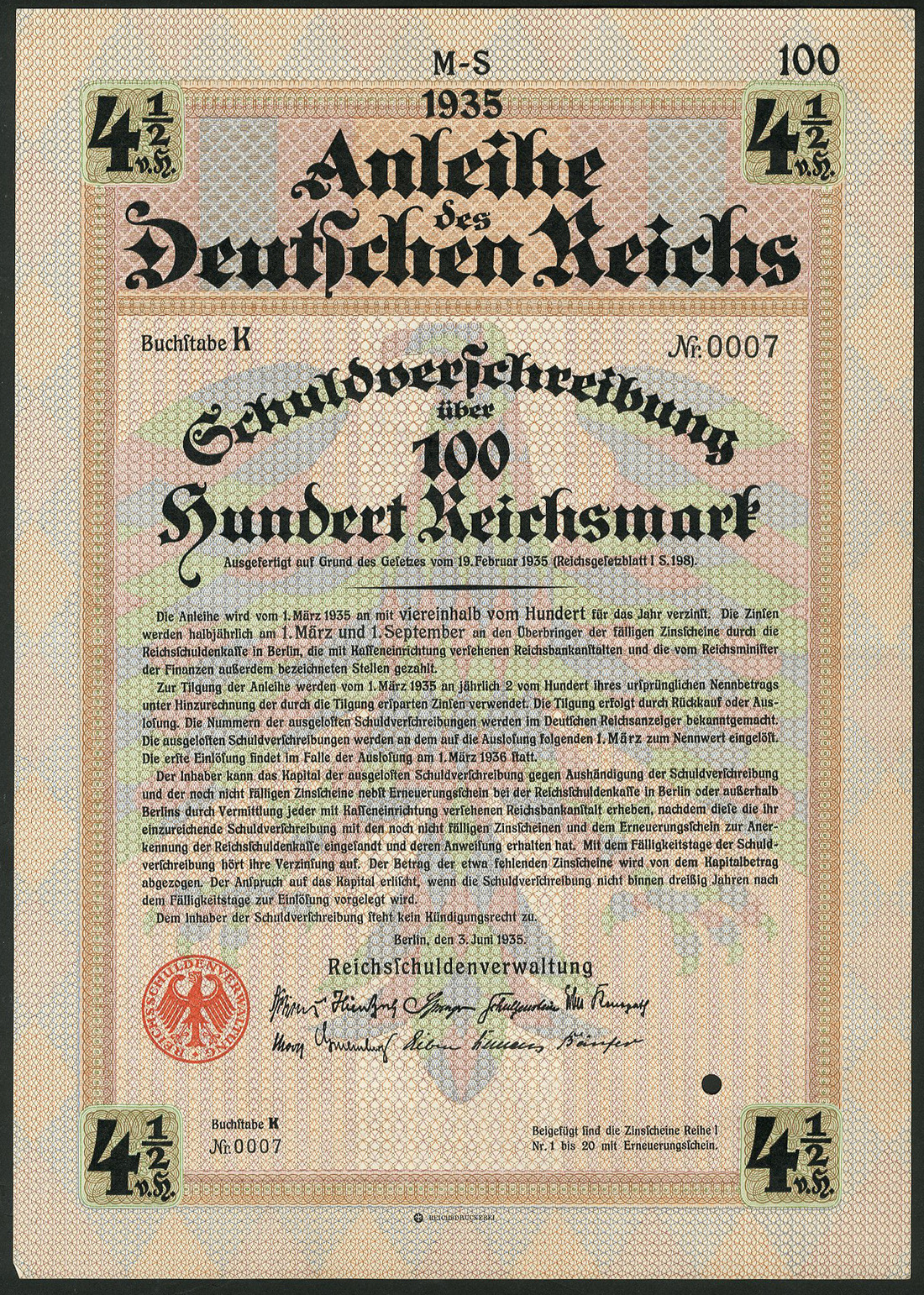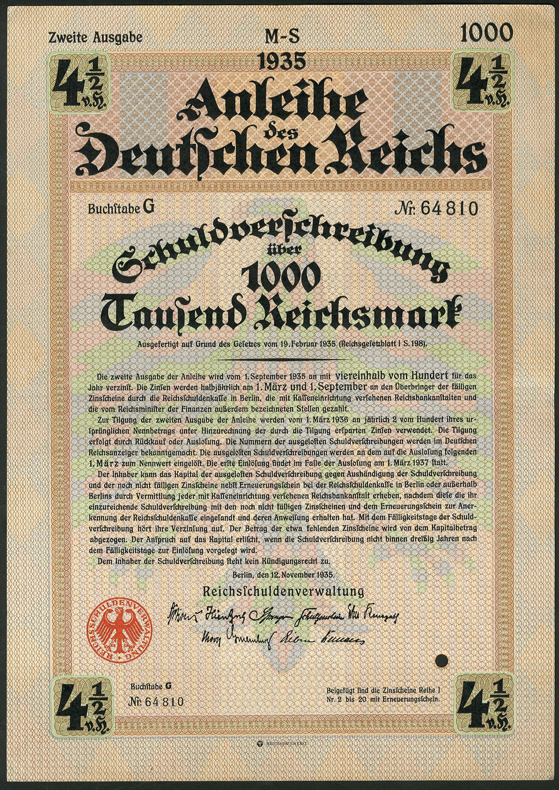 Anleihe des Deutschen Reichs 1935 Erste Ausgabe / Nazi-Loan 1935 First Issue, a group of 4158 x 4½% Schuldverschreibung, Berlin 3.6.1935 comprising 100 RM (38), 1,000 RM (2000), 10,000 RM (1700), 20,000 RM (158), 50,000 RM (120), 100,000 RM (142), [the majority located in Berlin], generally extremely fine. (4158 items)
