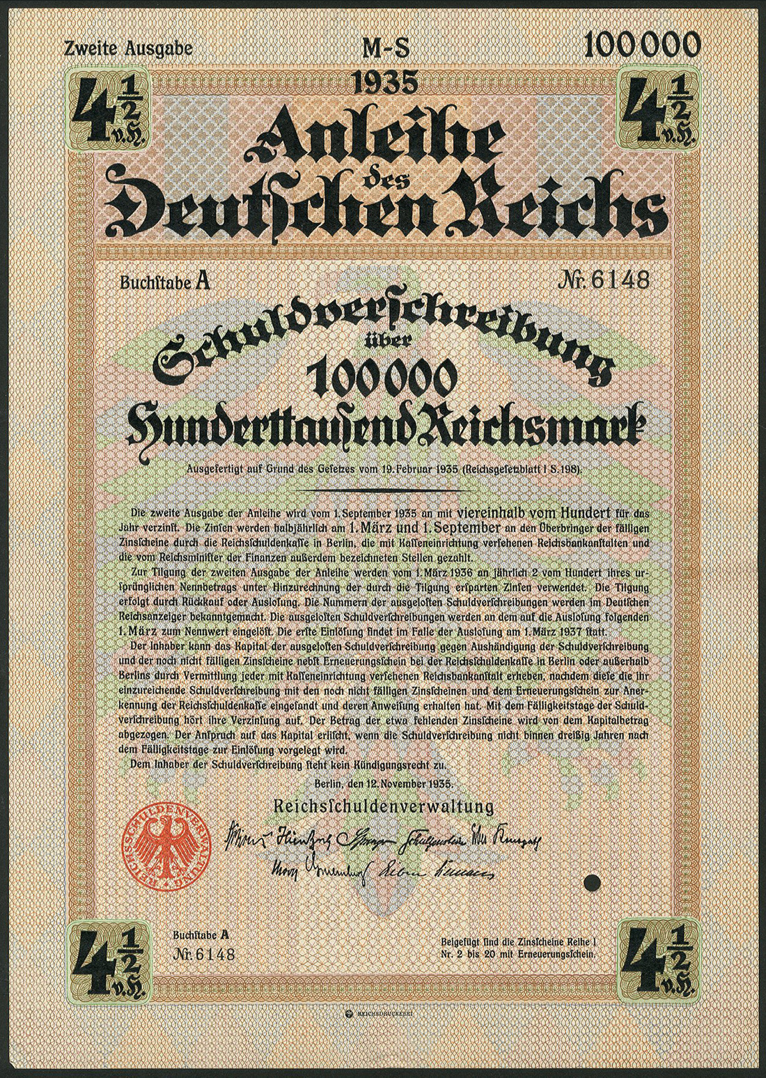Anleihe des Deutschen Reichs 1935 Zweite Ausgabe / Nazi-Loan 1935 Second Issue, a group of 3450 x 4½% Schuldverschreibung, Berlin 12.11.1935 comprising 100 RM (360), 1,000 RM (2400), 10,000 RM (123), 20,000 RM (343), 50,000 RM (187), 100,000 RM (37), [the majority located in Berlin], generally extremely fine. (3450 items)