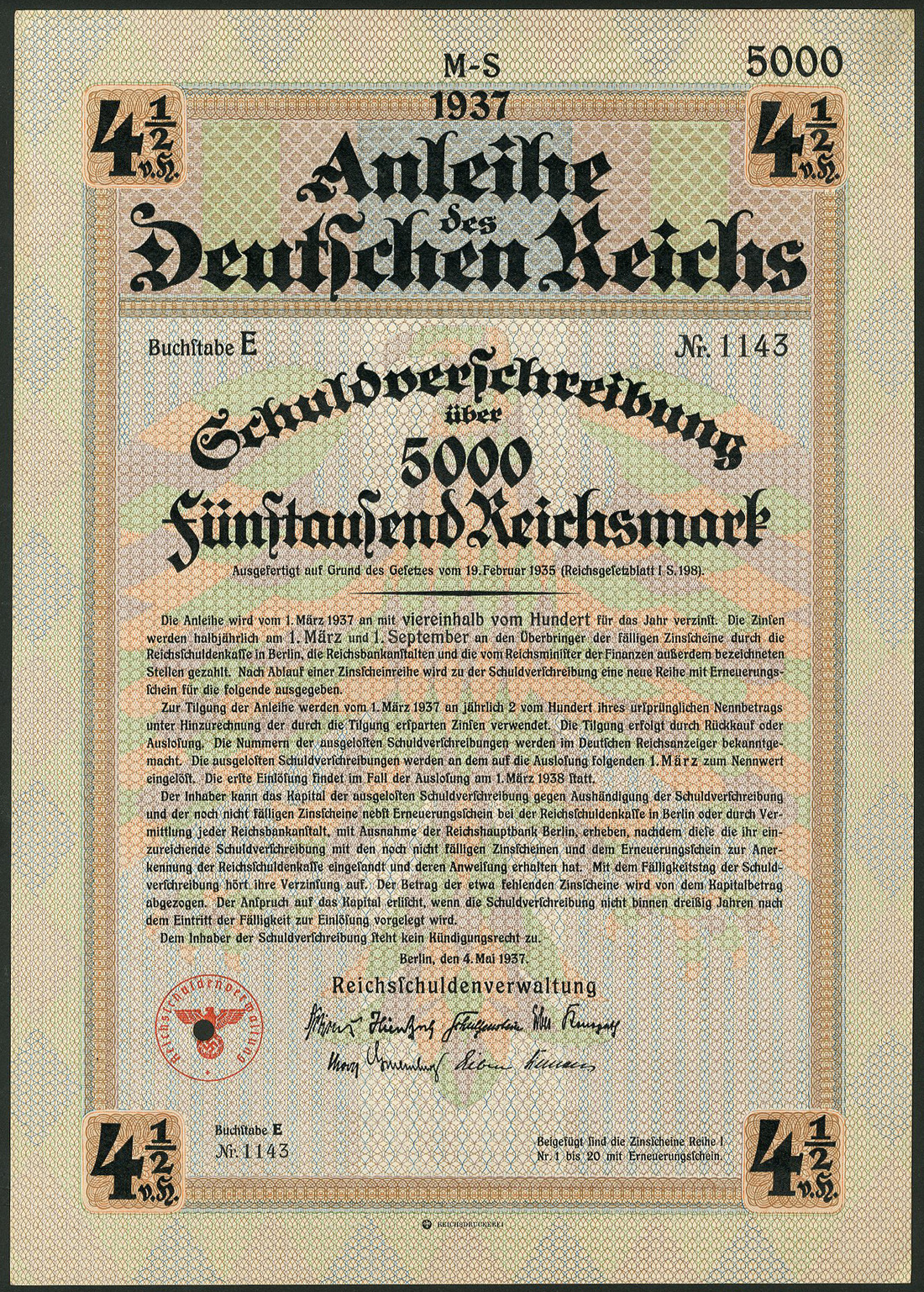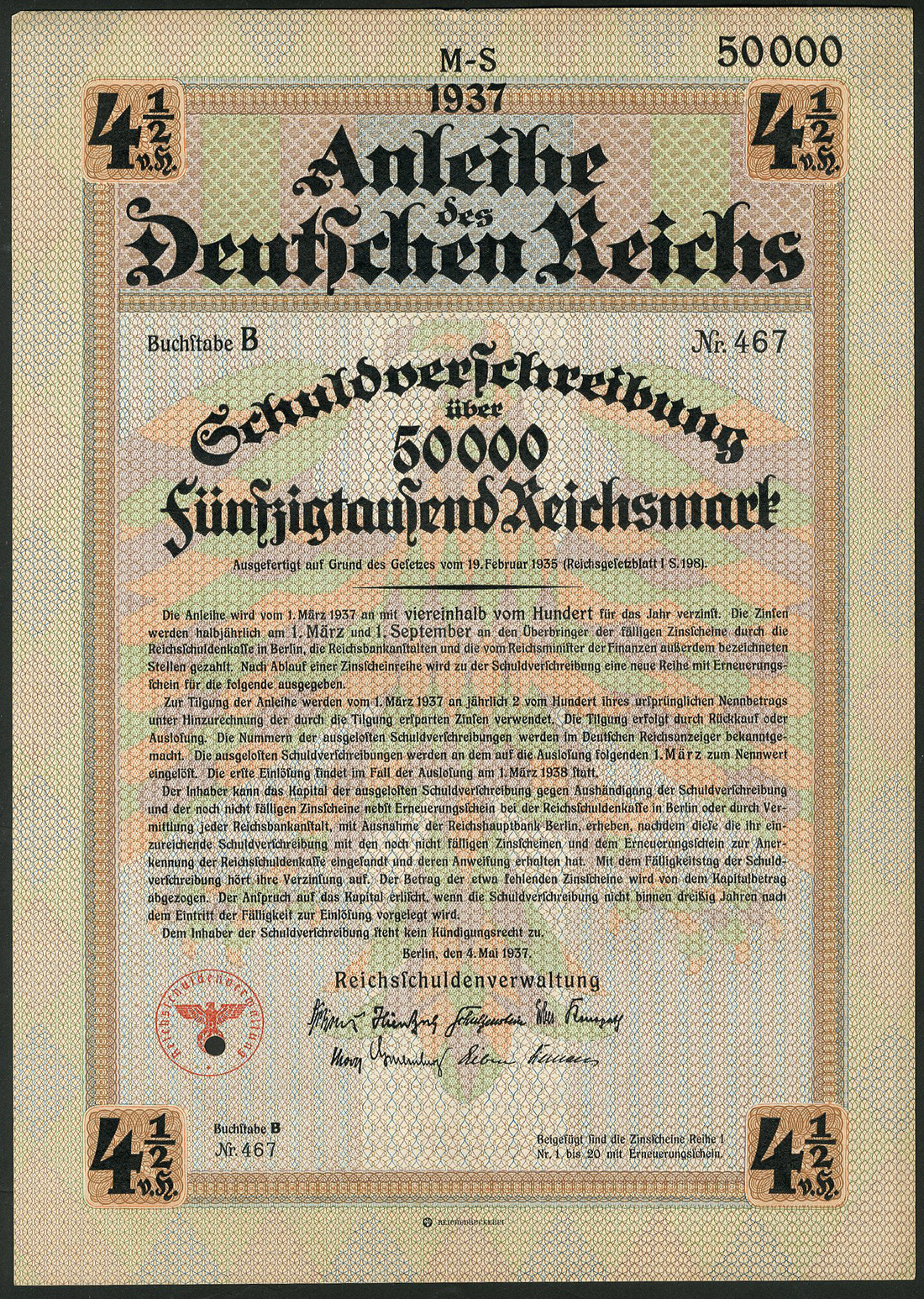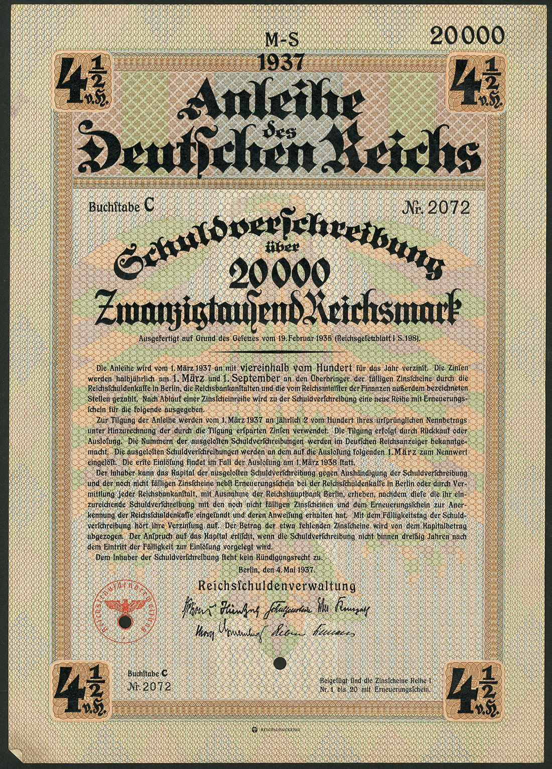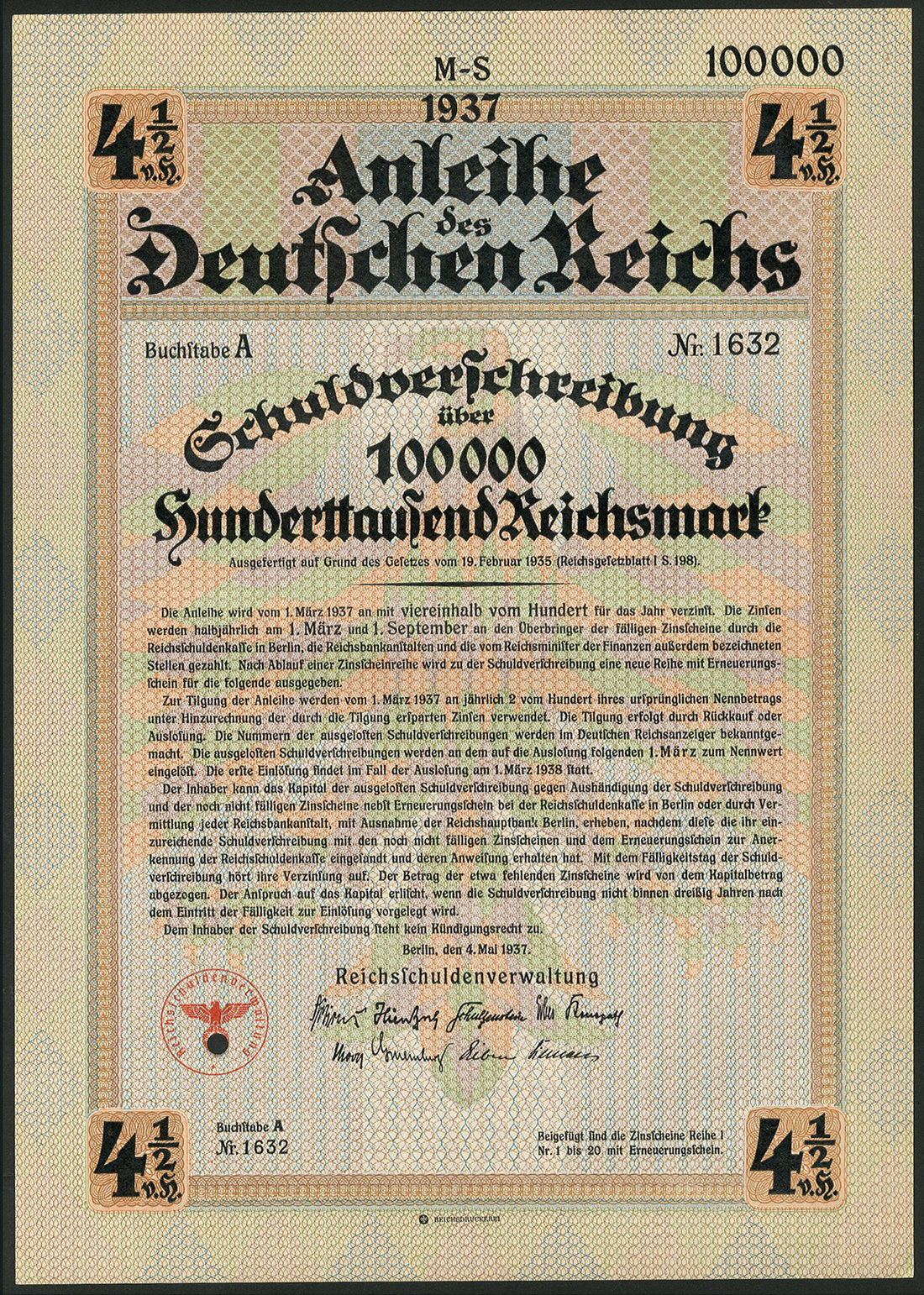 Anleihe des Deutschen Reichs 1937 / Nazi-Loan 1937, a group of 7826 x 4½% Schuldverschreibung Berlin 4.5.1937 comprising 100 RM (2200), 500 RM (2100), 1,000 RM (2300), 5,000 RM (600), 10,000 RM (230), 20,000 RM (180), 50,000 RM (29), 100,000 RM (187), [the majority located in Berlin], generally extremely fine. (7826 items)