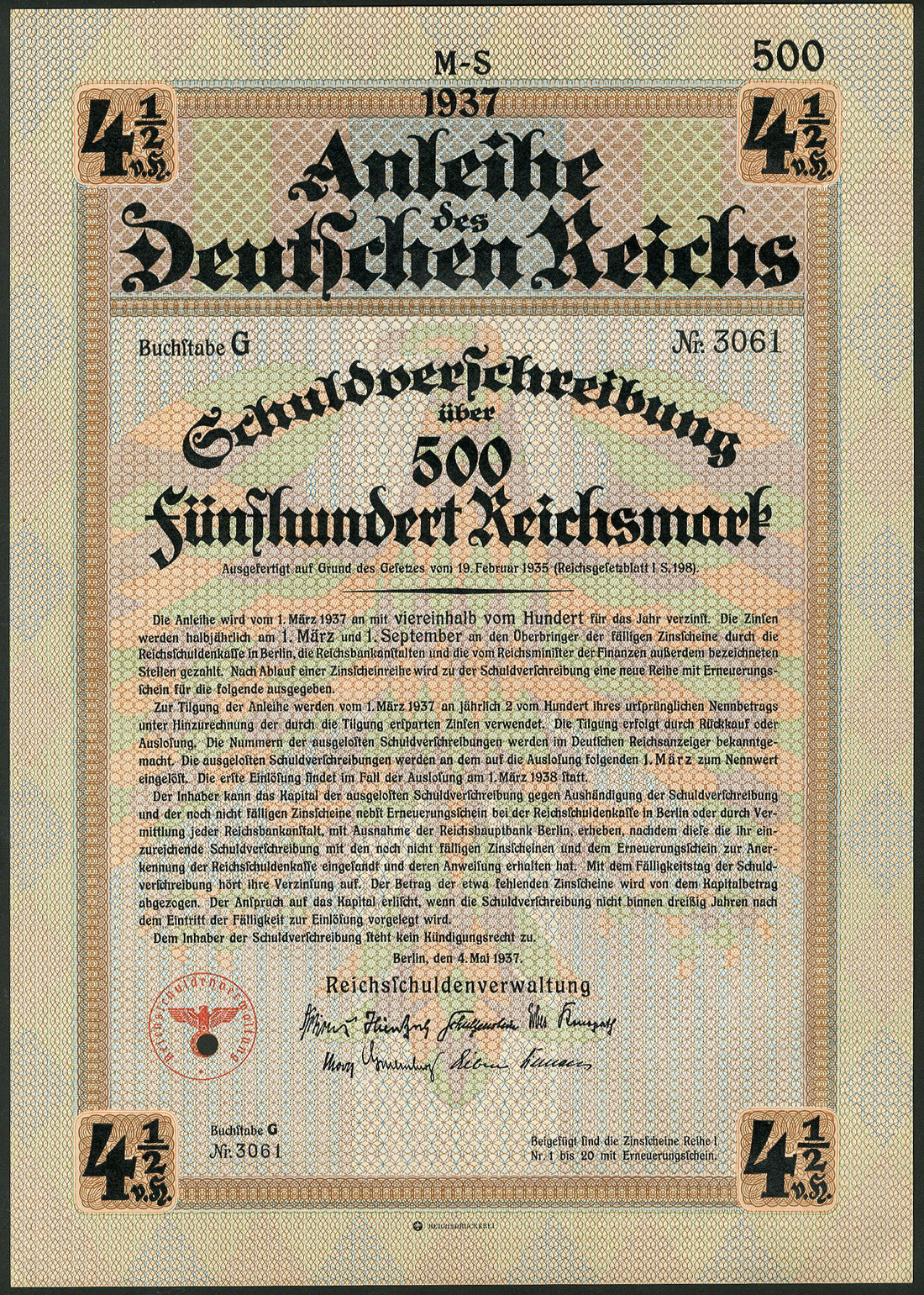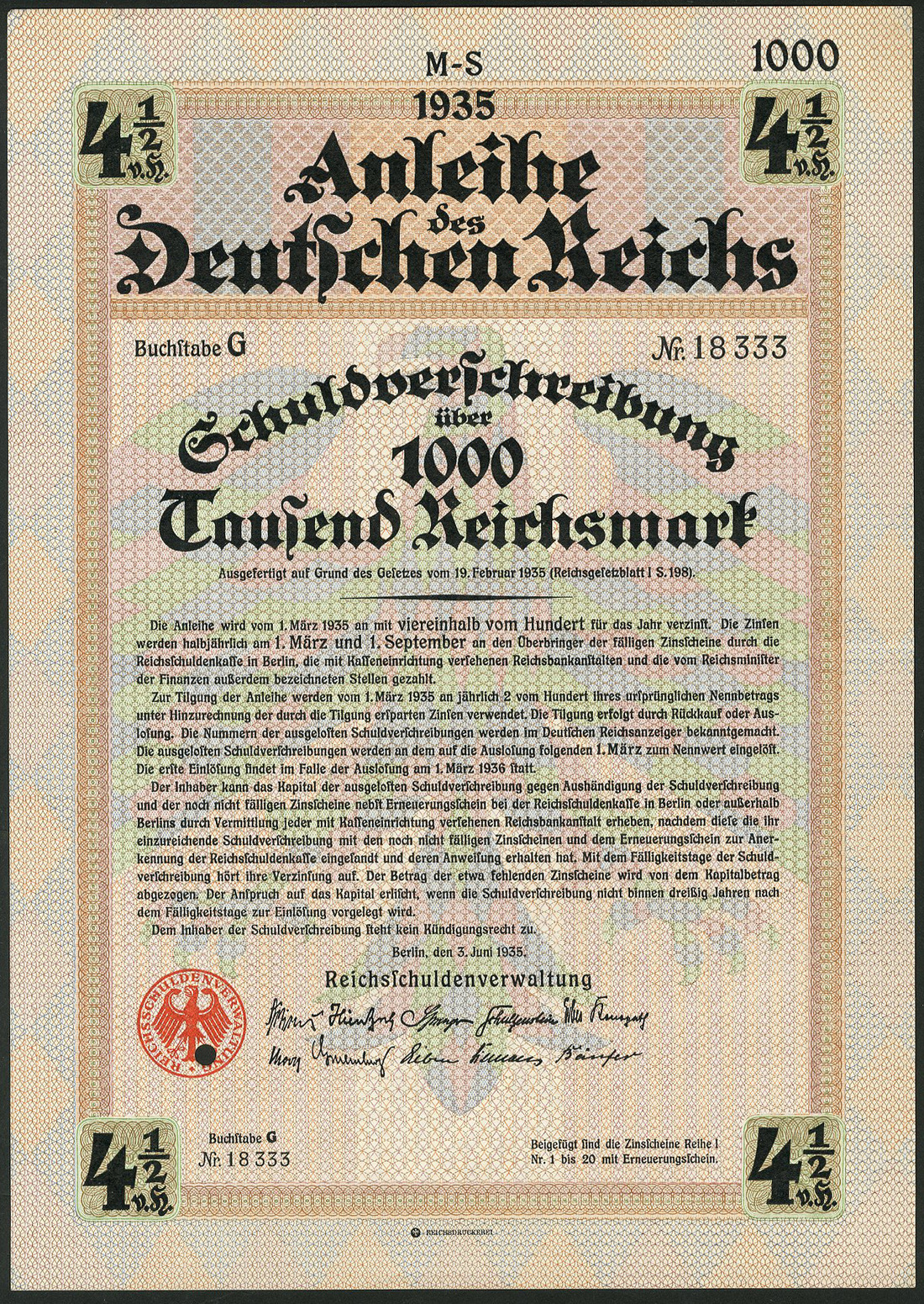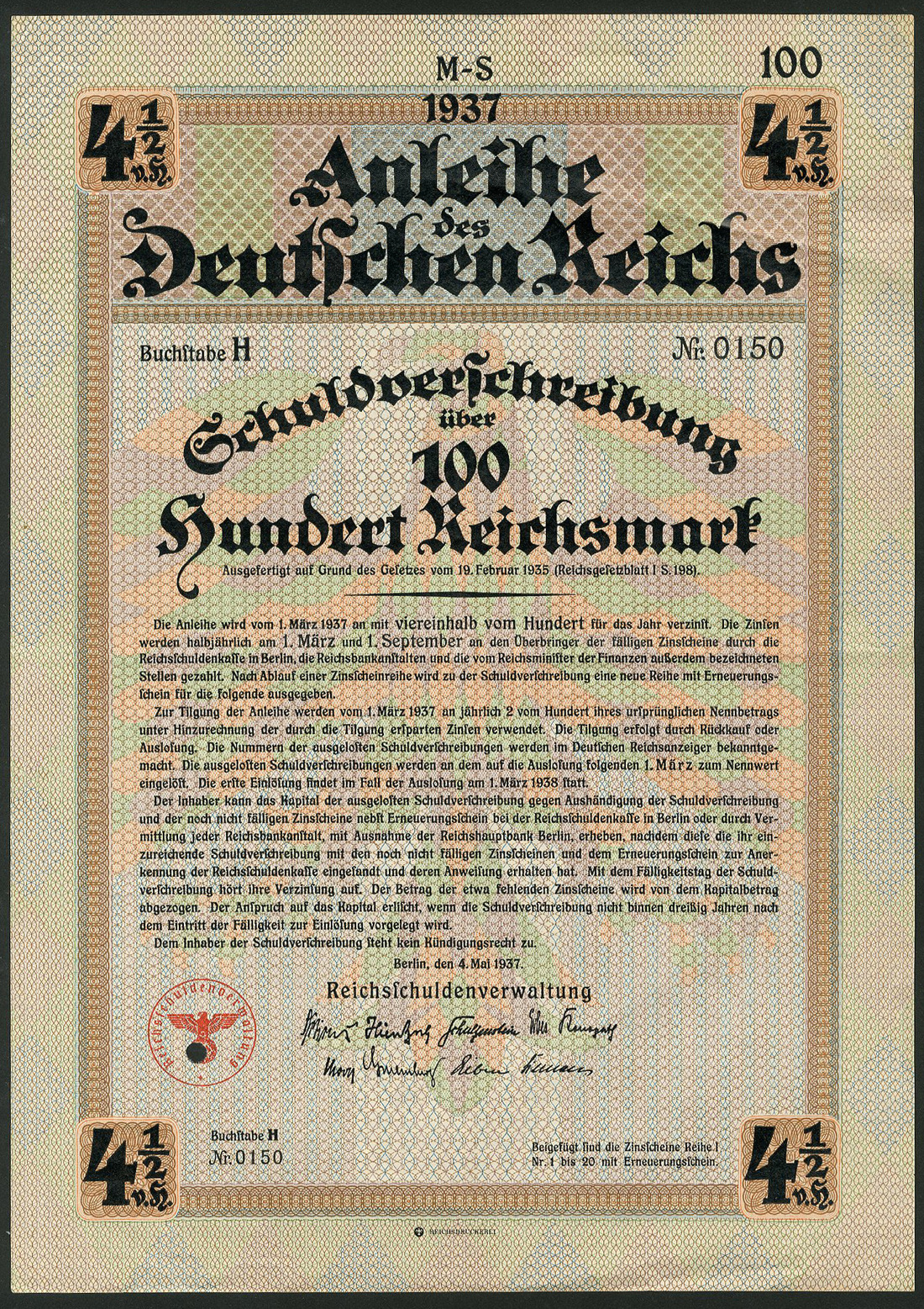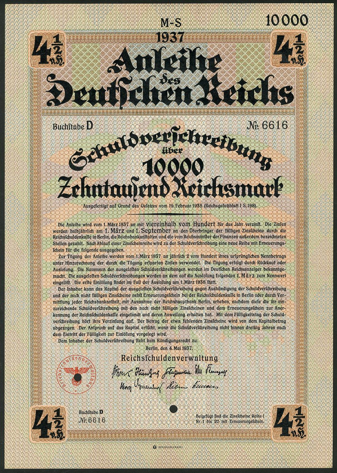 Anleihe des Deutschen Reichs 1937 / Nazi-Loan 1937, a group of 7826 x 4½% Schuldverschreibung Berlin 4.5.1937 comprising 100 RM (2200), 500 RM (2100), 1,000 RM (2300), 5,000 RM (600), 10,000 RM (230), 20,000 RM (180), 50,000 RM (29), 100,000 RM (187), [the majority located in Berlin], generally extremely fine. (7826 items)