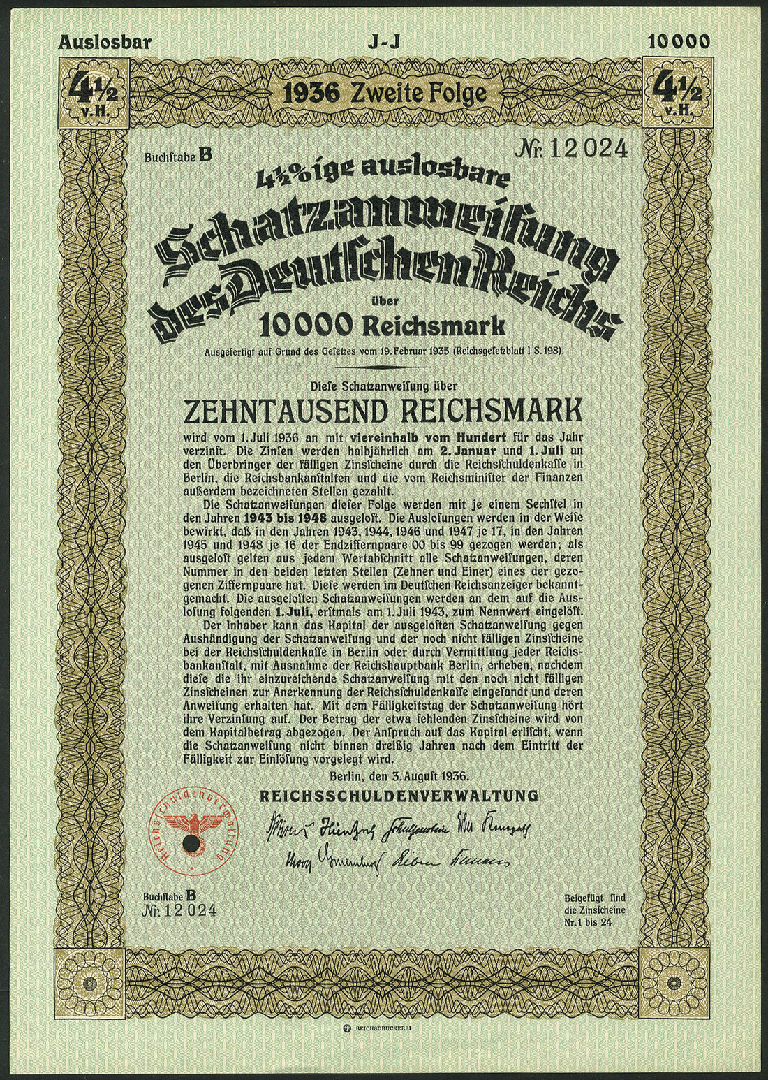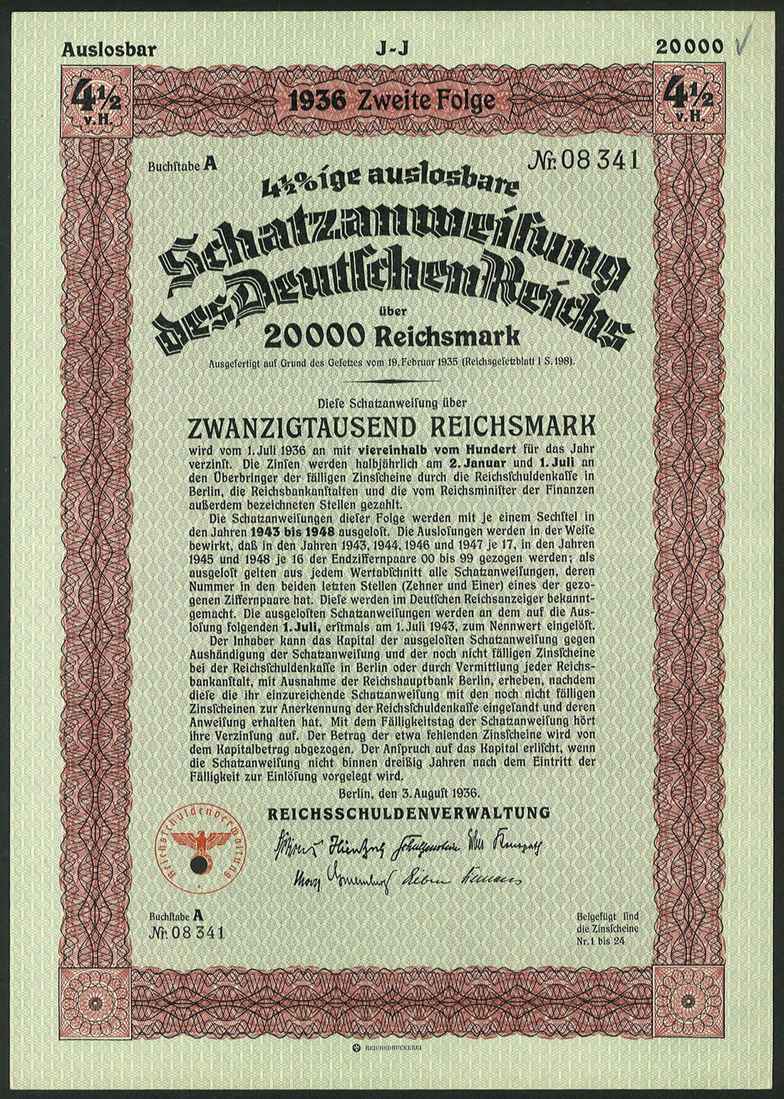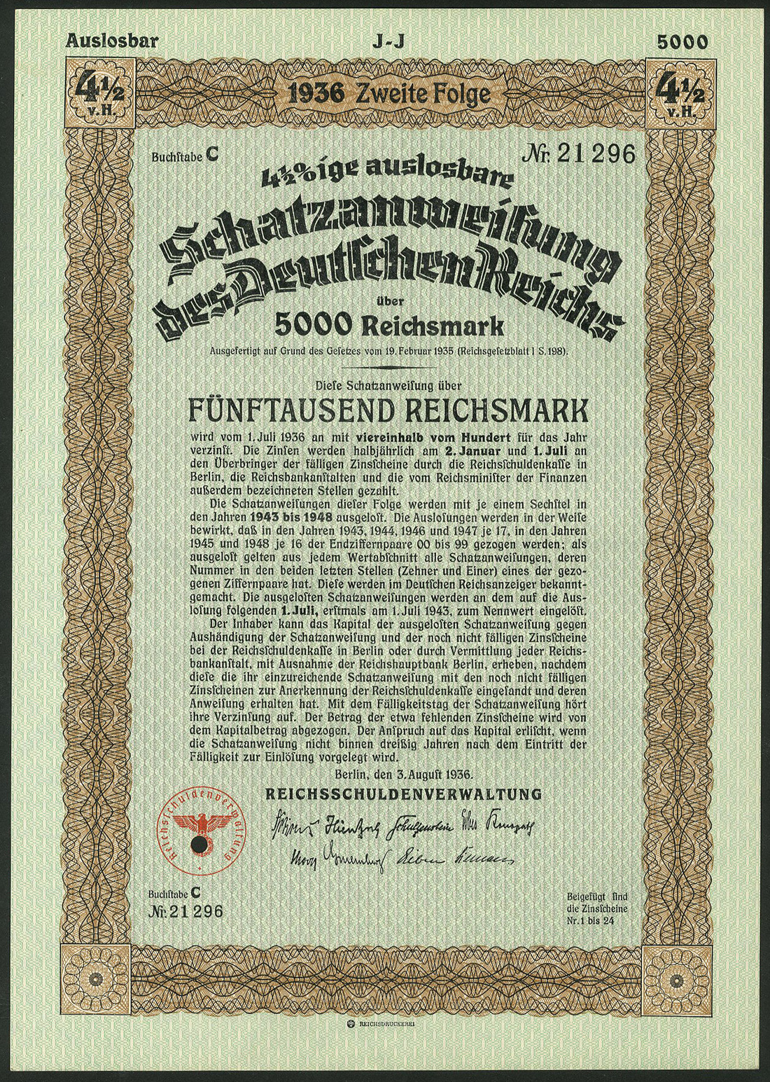 Schatzanweisung des Deutschen Reichs 1936 Zweite Folge / Nazi-Treasury Bill 1936 Second Release,