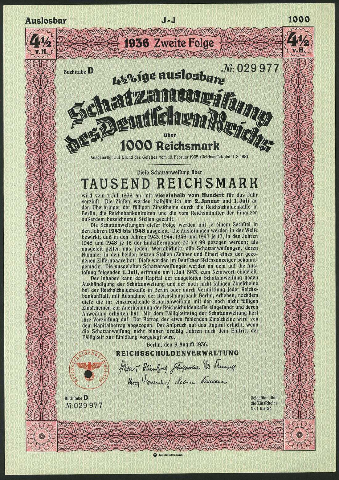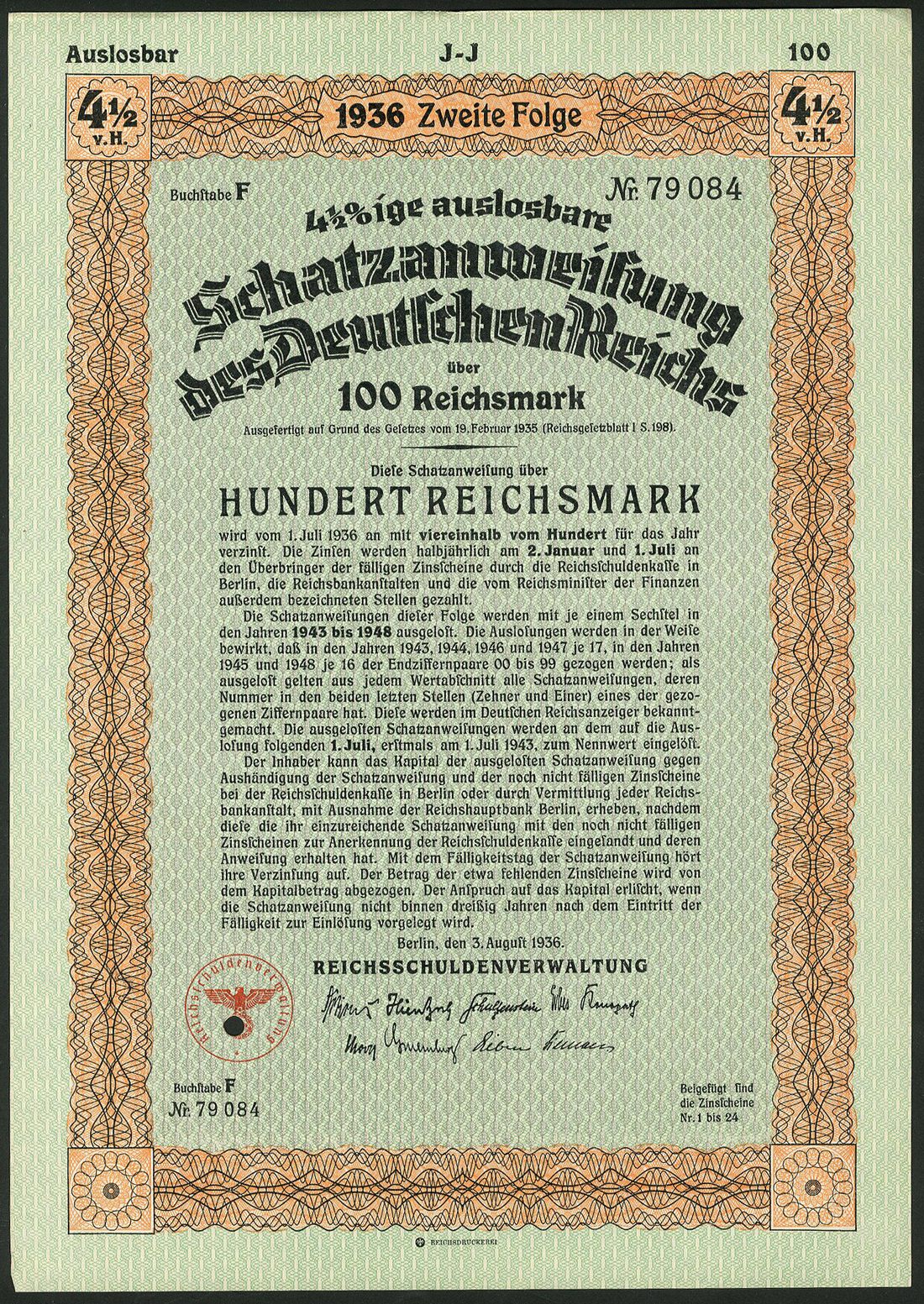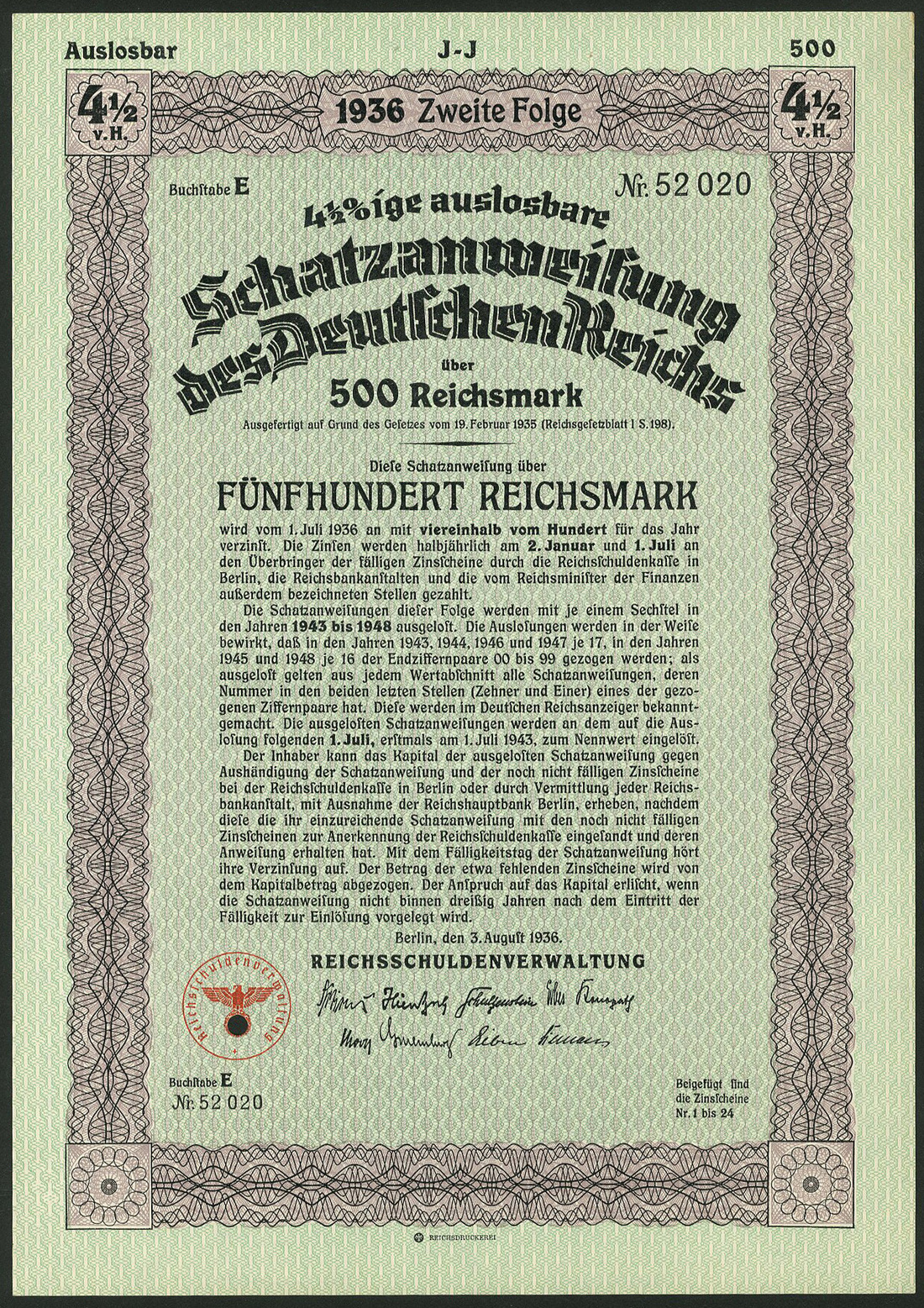 Schatzanweisung des Deutschen Reichs 1936 Zweite Folge / Nazi-Treasury Bill 1936 Second Release,