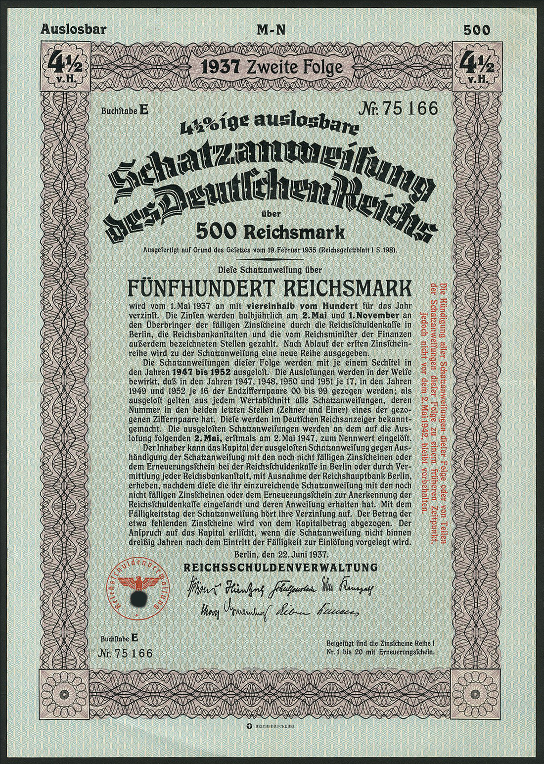 Schatzanweisung des Deutschen Reichs 1937 Zweite Folge / Nazi-Treasury Bill 1937 Second Release. 4½% Schatzanweisung 500 RM, Berlin 22.6.1937, one item only, extremely fine.