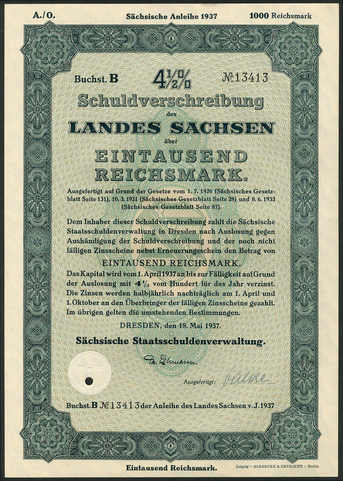 Land Sachsen 1937, a group of 200 x 4½% Schuldverschreibung, 1,000 RM, Dresden 18.5.1937, generally extremely fine. (200 items)