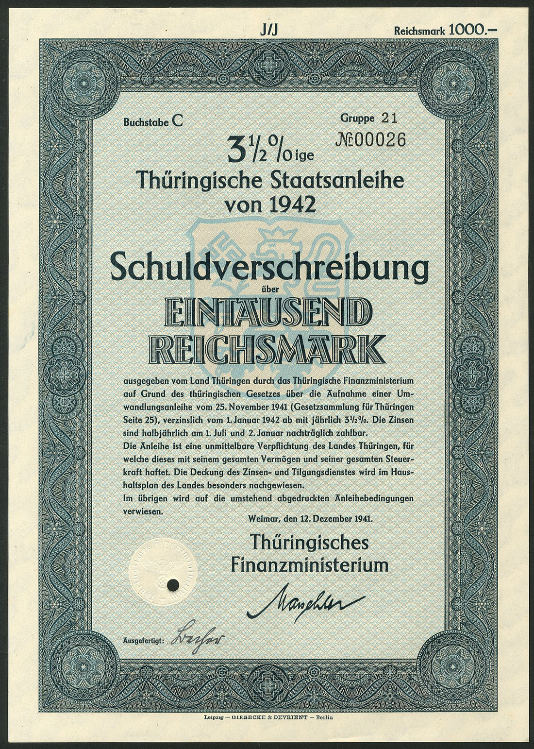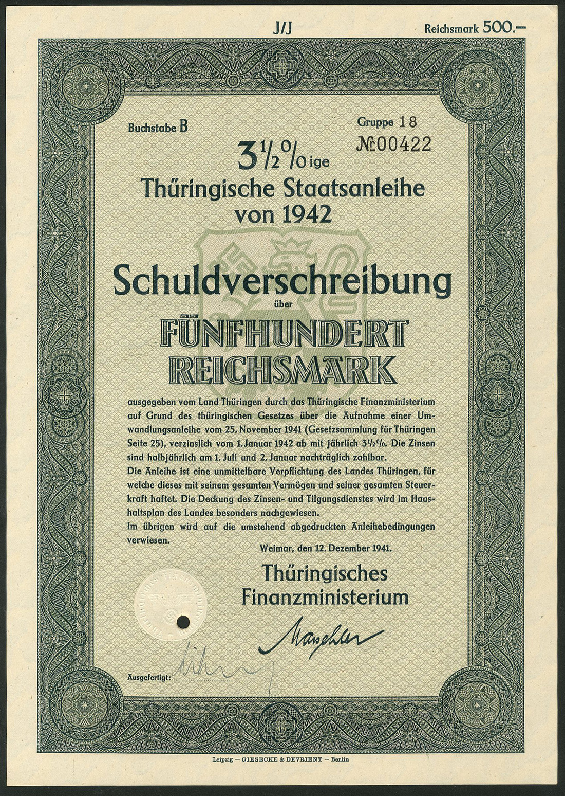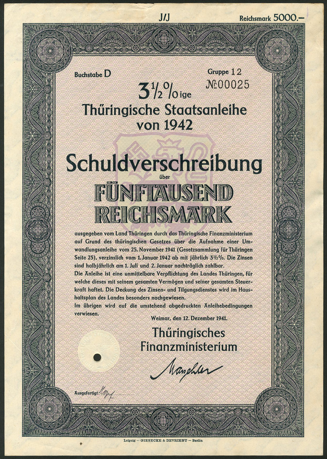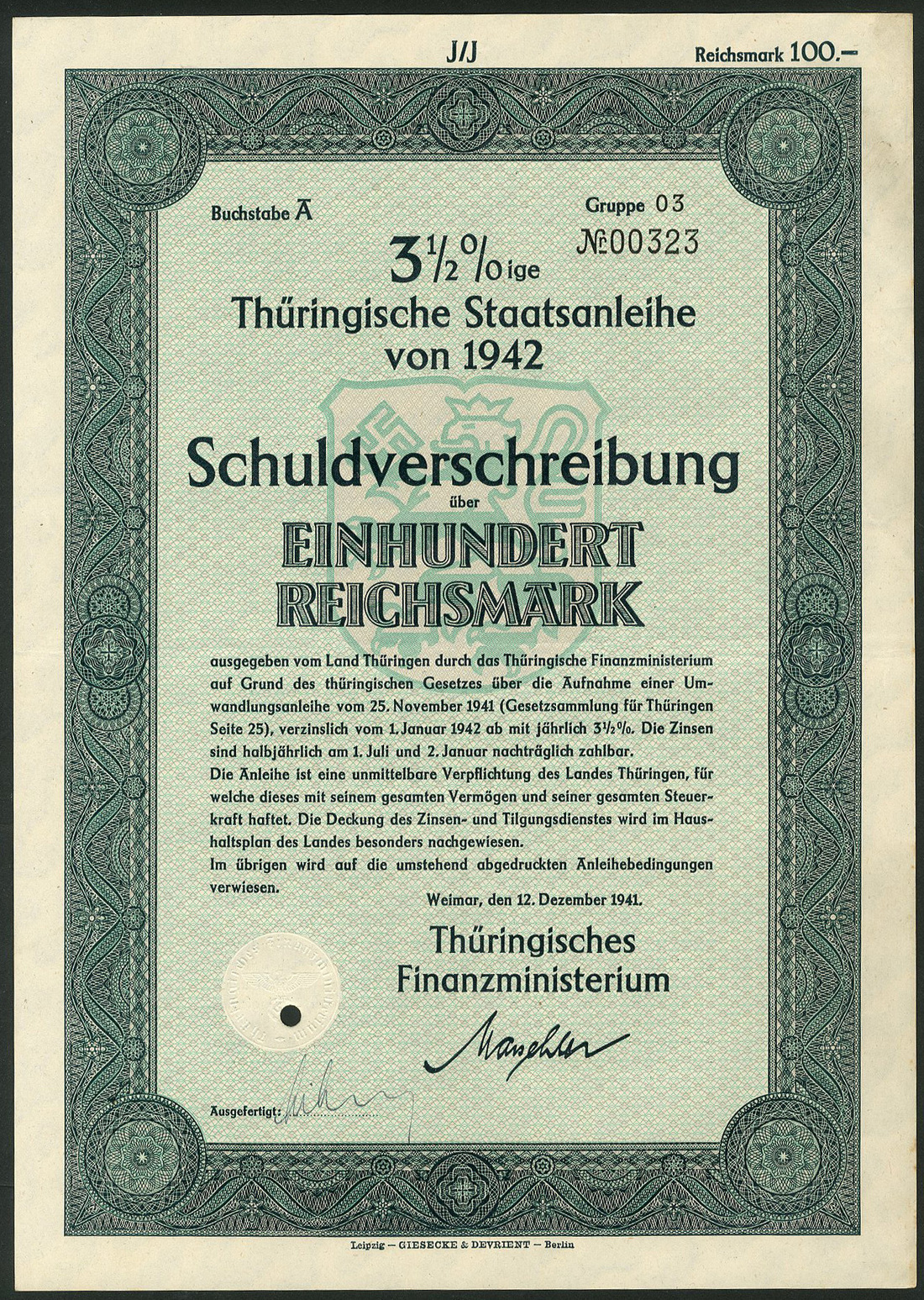 Thüringische Staatsanleihe 1942, the complete set of 27450 x 3½% Schuldverschreibung, Weimar 12.12.1941 comprising 100 RM (11273), 500 RM (4950), 1,000 RM (10900) and 5,000 RM (327), [the majority located in Berlin], generally extremely fine. (27450 items)