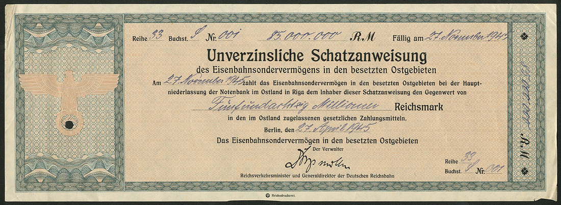Das Eisenbahnsondervermögen in den besetzten Ostgebieten, Unverzinsliche Schatzanweisung 85,000,000 RM, Berlin 27.4.1945, extremely fine and a unique piece!