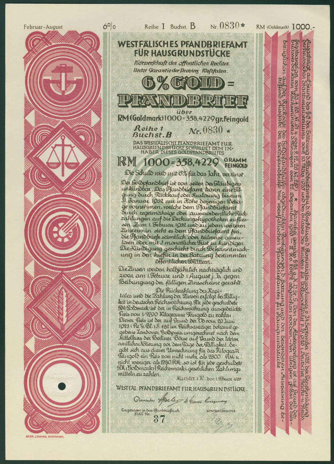 Westfälisches Pfandbriefamt für Hausgrundstücke, Münster, 6% mortgage gold bond for 1000 Reichsmark (Goldmark), 1 February 1927, ornate border, purple and black, coat of arms with horse in underprint, generally extremely fine. (250)