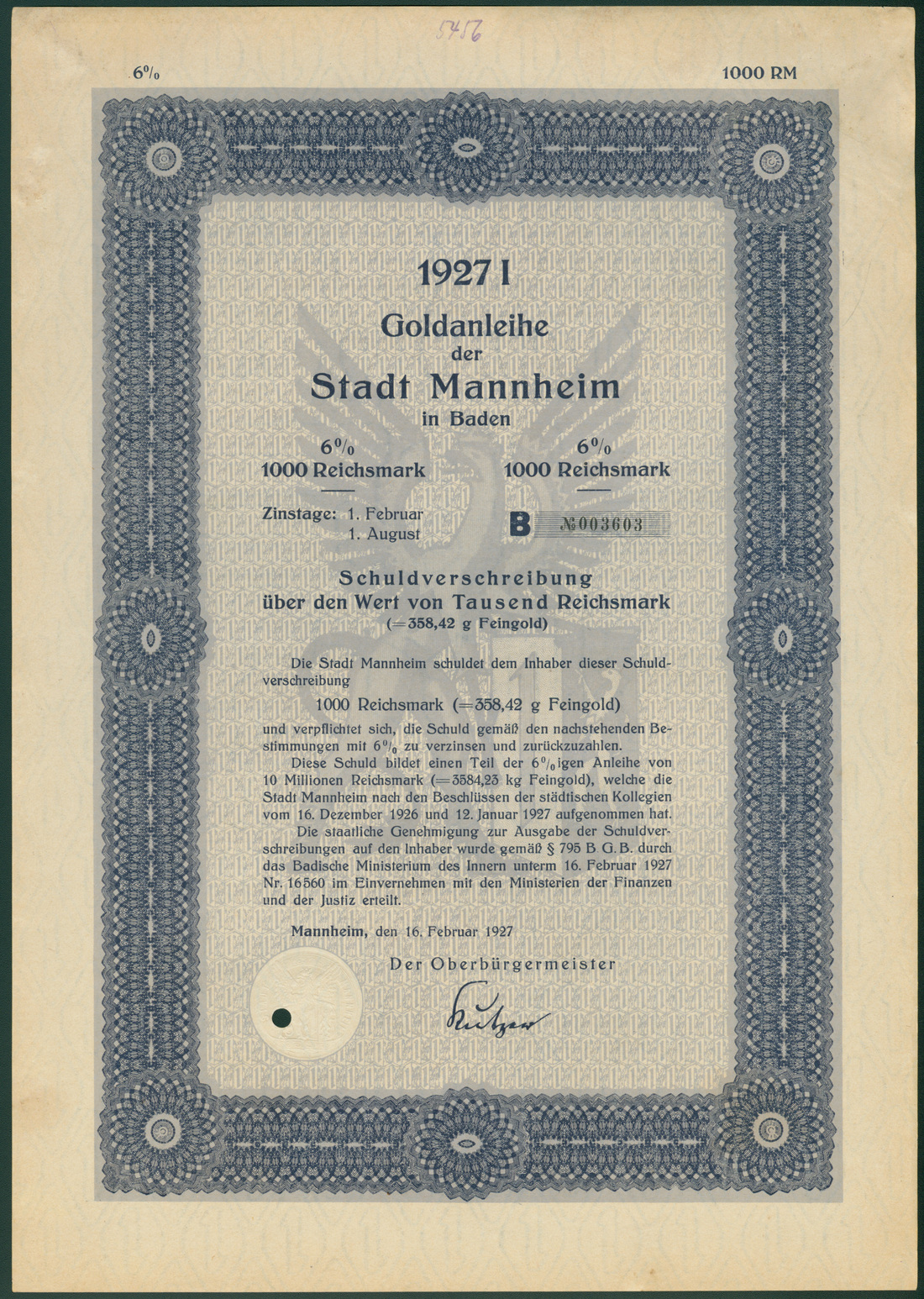 Stadt Mannheim, 6% Gold Loan of 1927, bond for 1000 Reichsmark, 16 February 1927, ornate border, blue, coat of arms with eagle in underprint, generally very fine. (30)