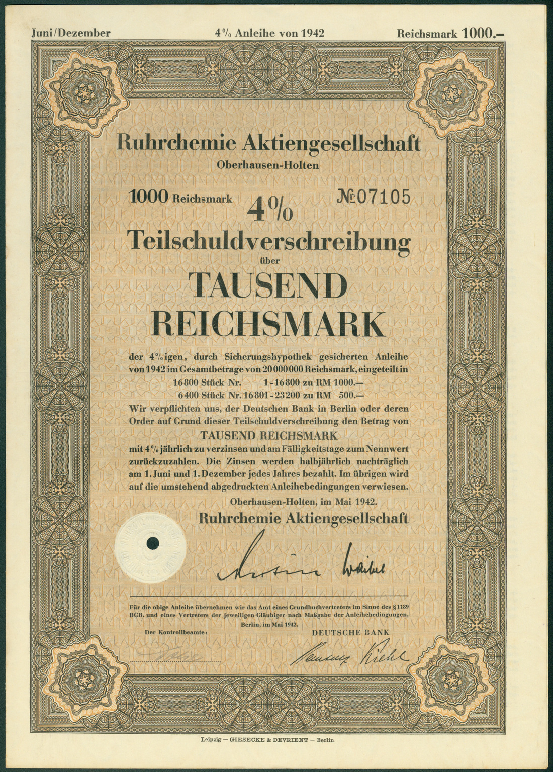 Ruhrchemie Aktiengesellschaft, Oberhausen-Holten, 4% bond for 1000 Reichsmark, May 1942, ornate border, brown and black, generally extremely fine. (100)