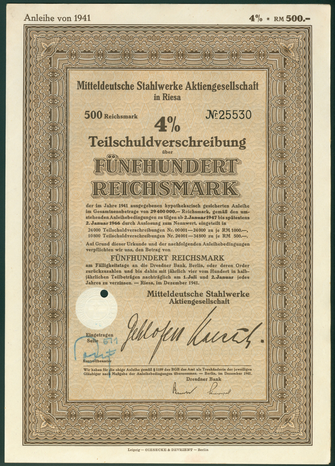 Mitteldeutsche Stahlwerke Aktiengesellschaft, Riesa, 4% bond for 500 Reichsmark, December 1941, ornate border, brown, generally extremely fine. (60)