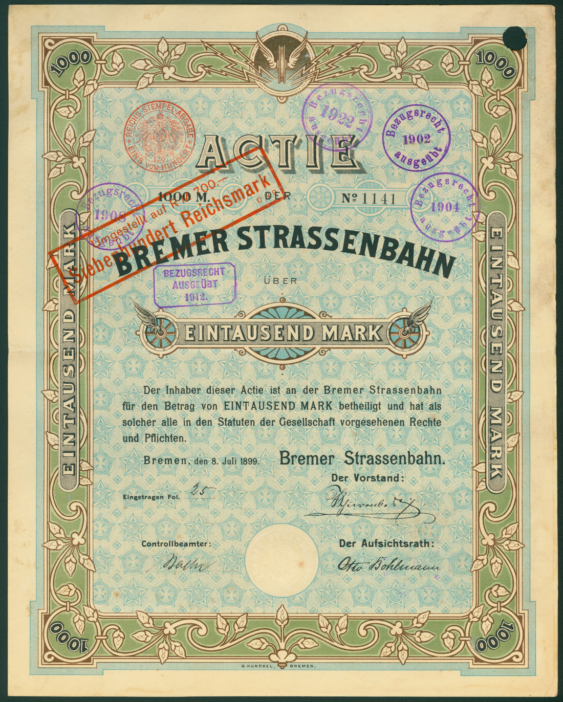 Bremer Strassenbahn, Bremen, 1000 marks share, 8 July 1899, light blue, green and black, very decorative design with ornate border, three winged wheels and stars in underprint, generally affected by soiling, otherwise mostly extremely fine. (62)
