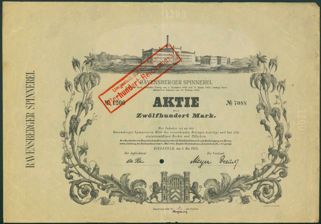 Ravensberger Spinnerei, Bielefeld, 1200 marks share, 4 May 1923, beige and black, very decorative design with large vignette of company building and ornate border consisting of coat of arms with two lions and two climbing plants, generally fine to very fine. (32)