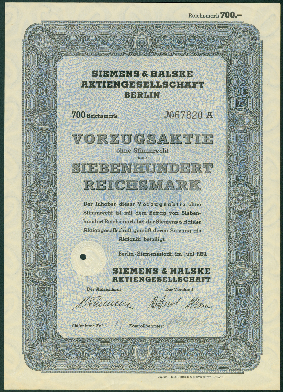 Siemens & Halske Aktiengesellschaft, Berlin-Siemensstadt, 700 Reichsmark preference share, June 1939, blue and black, ornate border, generally good very fine to extremely fine. (26)