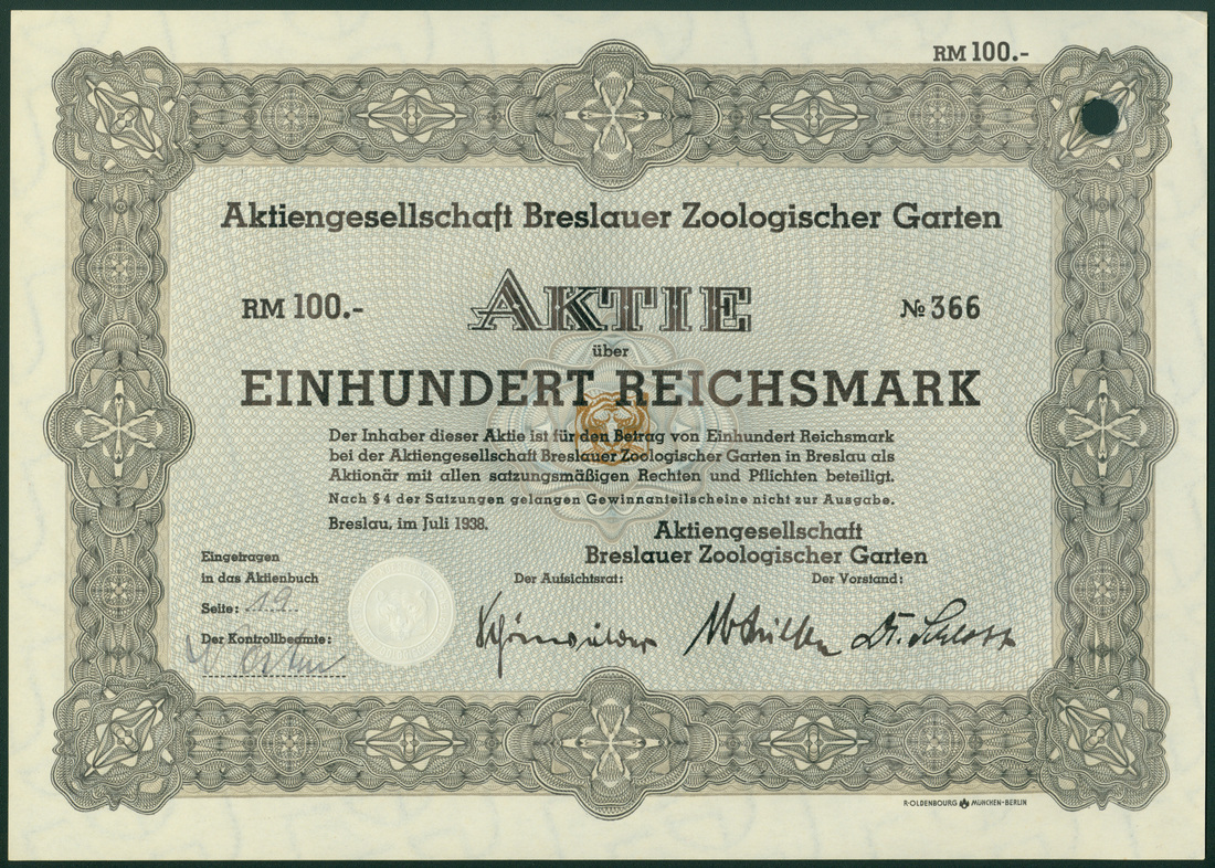 Aktiengesellschaft Breslauer Zoologischer Garten, Breslau, 100 Reichsmark share, July 1938, grey and black, ornate border, panther head in underprint, embossed seal with another panther head, generally extremely fine. (7)