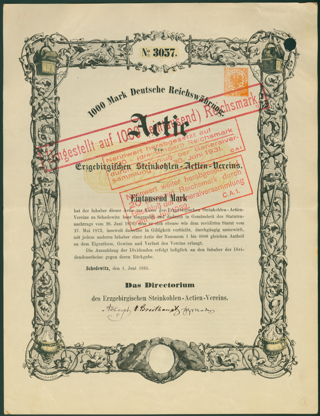 Erzgebirgischer Steinkohlen-Actien-Verein, Schedewitz, 1000 marks share, 1 June 1885, black, very decorative design with ornate border and five vignettes with two conveyor cages, stones and two antique caldrons, embossed seal with miner, generally fine to very fine. (84)