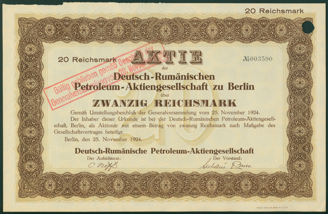 Deutsch-Rumänische Petroleum-Aktiengesellschaft, Berlin, 20 Reichsmark share, 25 November 1924, brown and green, ornate border, upper margin generally uneven due to removal of coupons, generally extremely fine. (150)