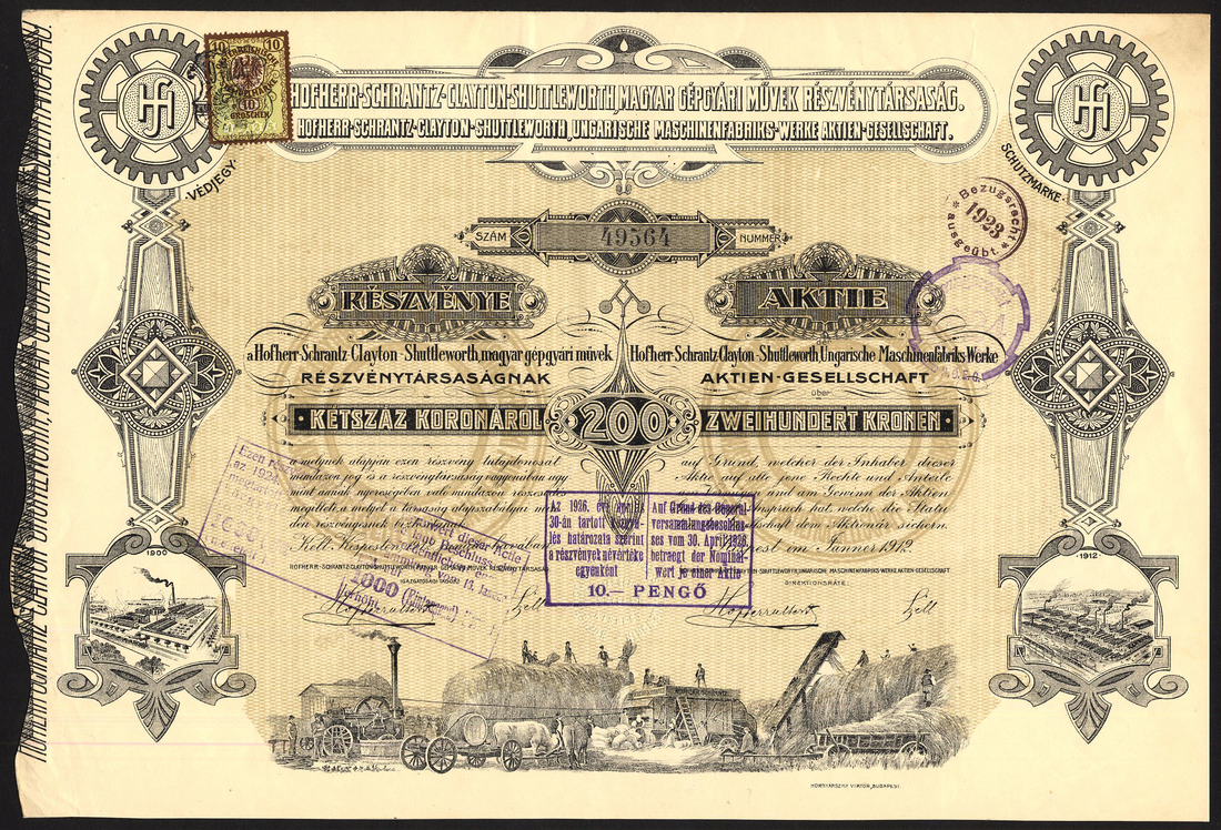 Hungary: Hofherr-Schrantz-Clayton-Shuttleworth, magyar gépgyári müvek (Hungarian factory machine works), 200 kronen share, 1912, no.49564, interesting piece with vignette of crops being sorted with agricultural machinery across bottom, inset vignettes of factory works at left and right, black and beige, text in Hungarian and German, very fine.