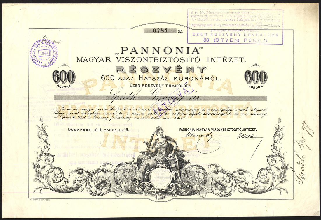 Hungary: "Pannonia" Magyar Viszontbiztosito Intezet, 600 korona share, Budapest 1911, no.0784, attractive piece with stylised Hungarian Queen at bottom with scrollwork at sides, black and buff, 4 pages, no coupons, small tip of bottom right corner missing, extremely fine.