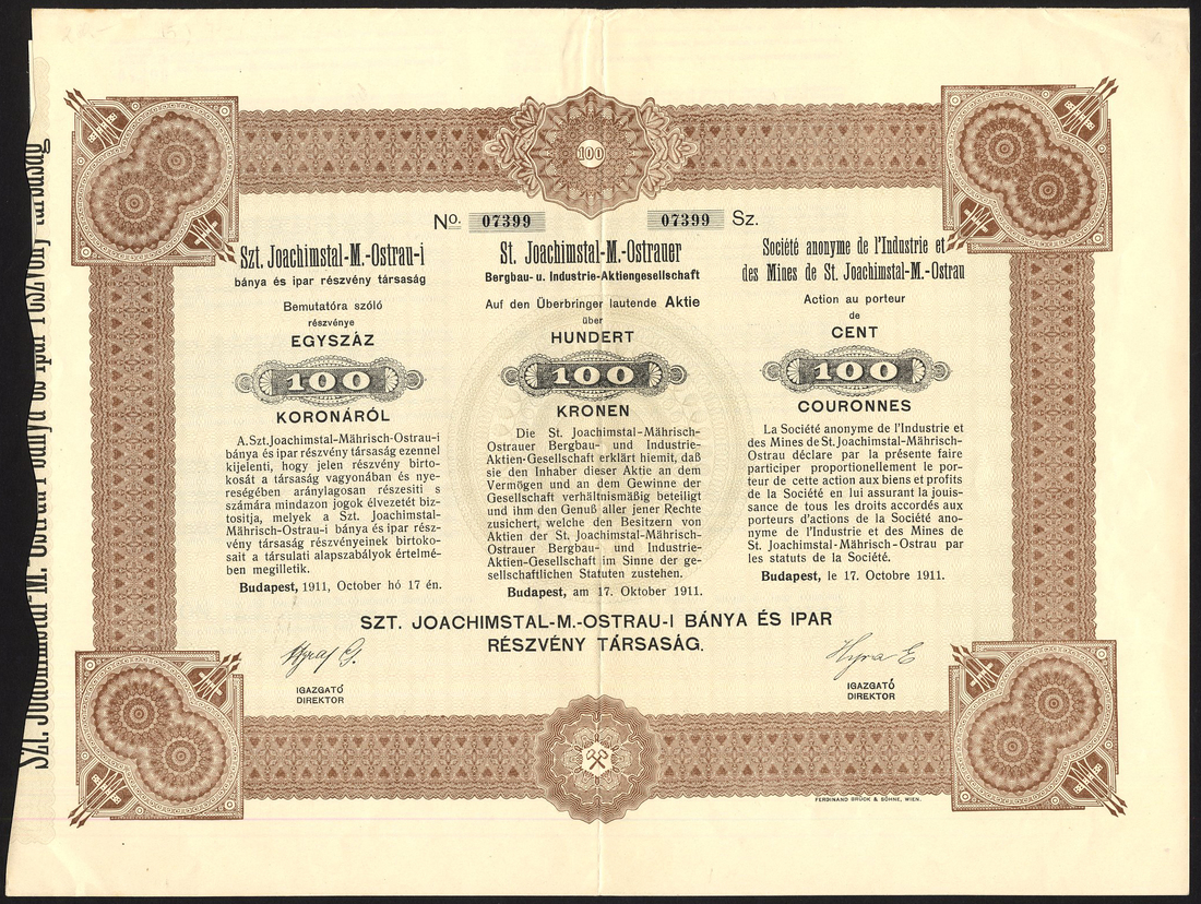 Hungary: S.A. de L'Industrie et des Mines de St.Joachimstal -M. -Ostrau, 100 kronen share, Budapest 1911, no.7399, ornate border, brown and black, text in Hungarian, German and French, with coupons, centre fold otherwise extremely fine.