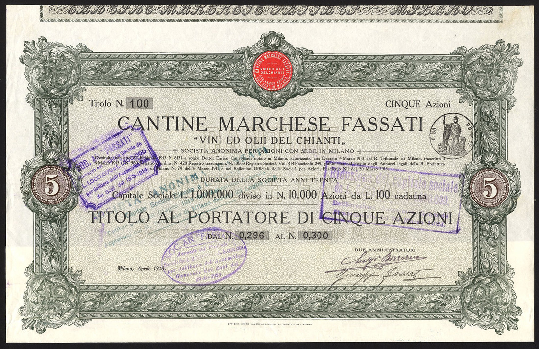 Italy: Cantine Marchese Fassati "Vini ed Olii del Chianti", 5 shares of 100 lire, Milano 1913, no.296-300, ornate border of acanthus leaves, grey green and red, with coupons, good very fine.