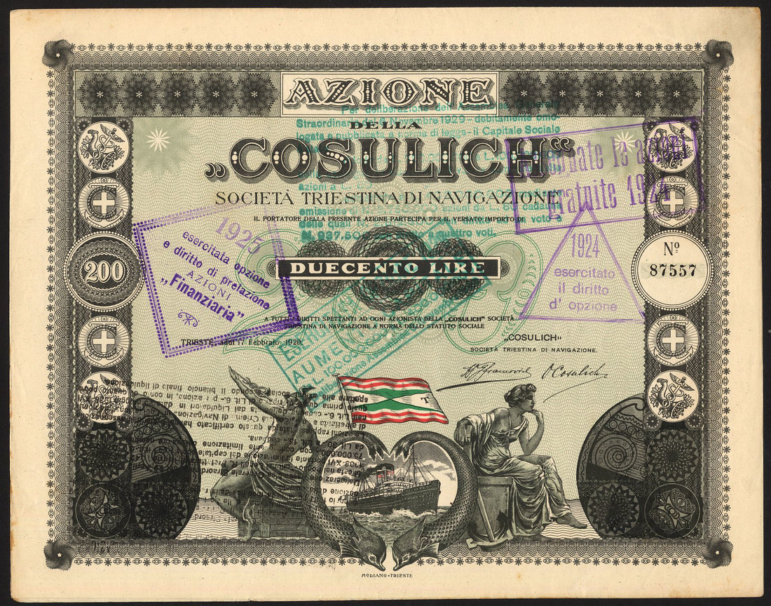 Italy: "Cosulich" Societa Triestina di Navigazione, 200 lire share, Trieste 1920, no.87557, two funnel steamship flanked by allegorical figures, coloured flag above, coats of arms at sides, black, green & red, green underprint, with coupons, extremely fine.