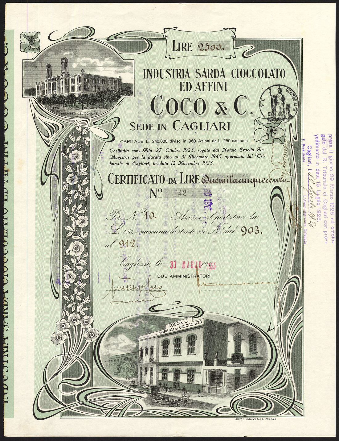 Italy: Industria Sarda Cioccolato ed Affini Coco & C., 250 lire share, Cagliari 192[5], no.42, of only 960 issued, attractive Art Nouveau design with State building top left and the chocolate factory at bottom, green, very fine.