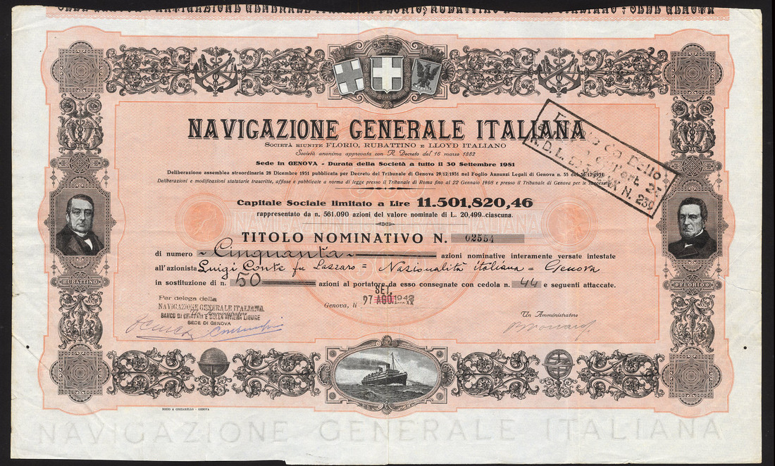 Italy: Navigazione Generale Italiana, nominative share of 20,999 lire, Genova [1942], no.02554, large format piece, vignettes of Rubattino at left and Florio at right, steamship at bottom, ornate border, black and pink, very fine.