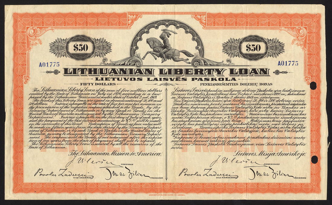 Lithuania: Lithuanian Liberty Loan, 1919, bond for $50 printed by the American Bank Note Co., no.A01775, stylised horseman in full armour at top, orange and black, text in English and Lithuanian, issued by the Lithuanian Mission to America, no coupons remain, 2 punch holes in right margin, very fine. [R11*]