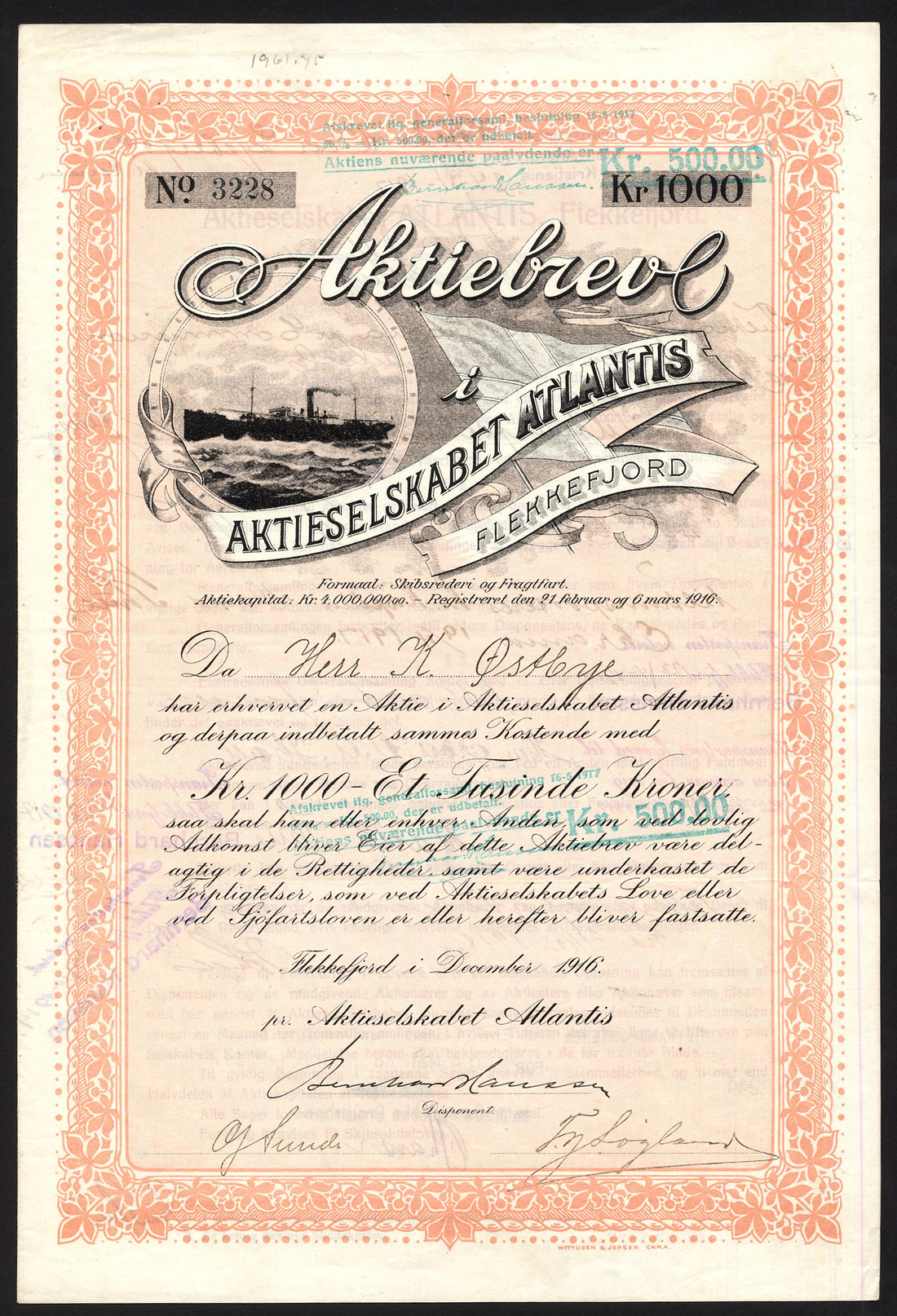 (x) Norway: Aktieselskabet Atlantis, 1,000 krone share, Flekkefjord 1916, no.3228, vignette of the Steamship within title, ornate border, black and peach, very fine.