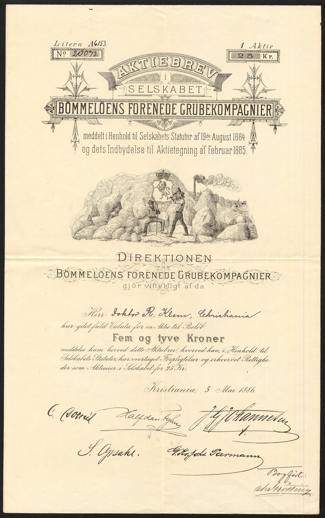 (x) Norway: Bömmelöens Forenede Grubekompagnier, 25 krone share, Christiania 1886, no.20073, lovely vignette of two Gold miners preparing an area, black printing, heavy folds, about very fine.