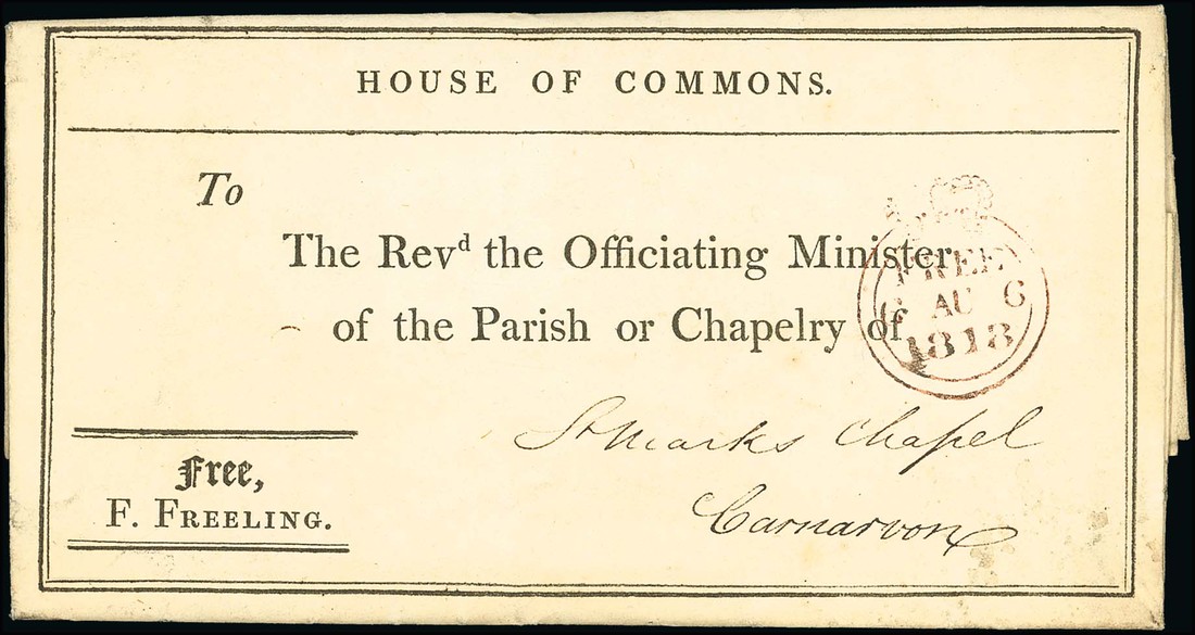 1813 (6 Aug.) pre-printed free frank entire headed "house of commons" bearing "free/F. Freeling" in lower corner and addressed to Carnarvon bearing crowned free c.d.s. Fresh and fine. A rare cover, there being only two recorded. Photo