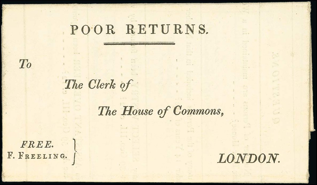 1821 (Nov.) pre-printed free frank entire headed "poor returns" bearing "free/F. Freeling" in lower corner and addressed to The Clerk of The House of Commons, London; sent from Aylsham, Norfolk and without any postal marking. Fresh and fine. Photo