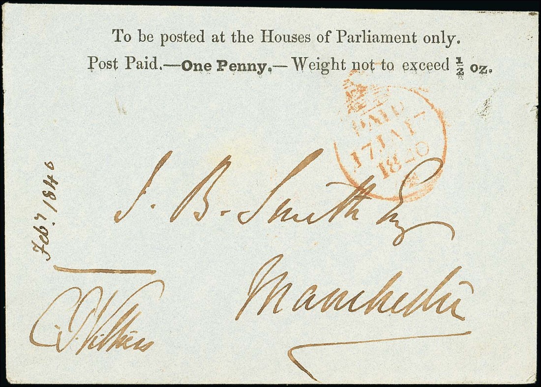 1840 (17 Jan.) 1d. envelope in black without line under inscription, setting 1, addressed to Manchester and signed "C.P.Villiers" and bearing a good strike of the crowned Paid despatch c.d.s. in red. The reverse with a complete red wax seal "house of commons"; a small fragment of the flap missing. Fresh and fine. A rare and highly desirable example of this cover, used on the second day of issue. Only ten covers recorded. S.G. PE1, £22,000. Photo