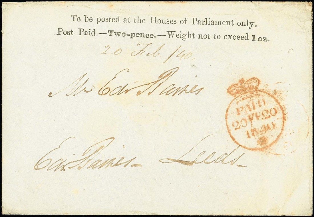 1840 (20 Feb.) 2d. printed in black without black line under inscription, setting 1, on Britannia watermarked paper, addressed to Leeds with crowned Paid despatch c.d.s. in red, the reverse with black wax seal "house of commons". Fine and rare. Only thirteen covers recorded. S.G. PE3b, £45,000. Photo