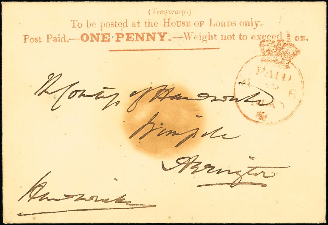 1840 (6 Apr.) 1d. envelope printed in vermilion on cream wove paper (122x83mm) with "(Temporary)" at top, addressed to a member of his family at their estate, Wimpole, Arrington (Cambridgeshire) and signed "Hardwicke"; bearing a fair strike of crowned Paid in red. The reverse with red wax seal bearing the lord's crest. There is a brown stain in the centre of the address caused by the wax seal, otherwise exceptionally fresh and fine. Similar to setting 2C but with subtle variations in the positions of the type. Twenty one covers recorded on cream paper. S.G. PE6, £25,000. Photo